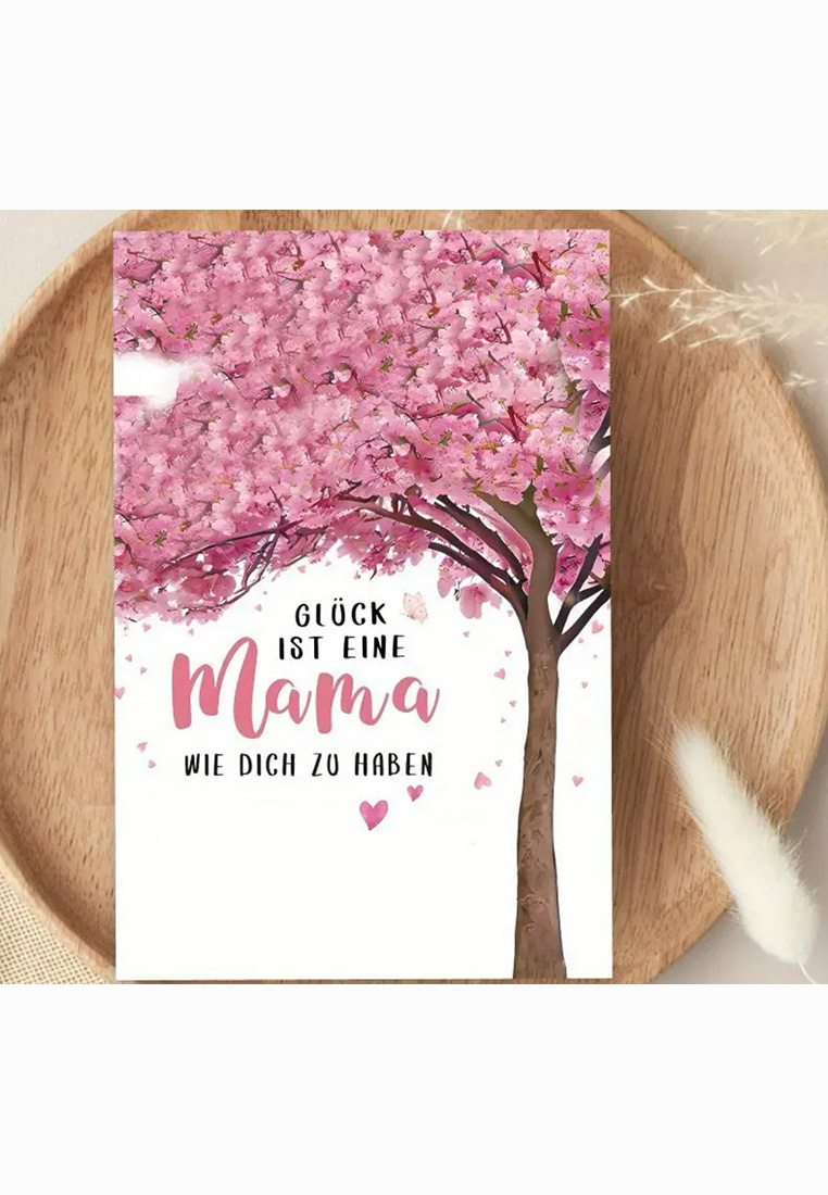 Diese wunderschöne Grußkarte ist eine liebevolle Art, einer Mama „Danke“ zu sagen und ihr eine besondere Freude zu bereiten. Das Motiv zeigt einen traumhaften Kirschblütenbaum in zarten Rosatönen, der für Wärme, Geborgenheit und Liebe steht. Der liebevolle Spruch „Glück ist eine Mama wie dich zu haben“ unterstreicht die Wertschätzung und Dankbarkeit, die mit dieser Karte ausgedrückt wird. Die harmonische Gestaltung mit kleinen Herzen und Schmetterlingen macht sie zu einer perfekten Wahl für Muttertag, Geburtstag oder einfach als herzliche Geste zwischendurch. Hergestellt aus hochwertigem Papier bietet sie auf der Rückseite ausreichend Platz für eine persönliche Nachricht. Diese Karte ist eine wundervolle Möglichkeit, einer Mama zu zeigen, wie wertvoll sie ist. Inklusive Couvert. Masse: 18cmx12cm