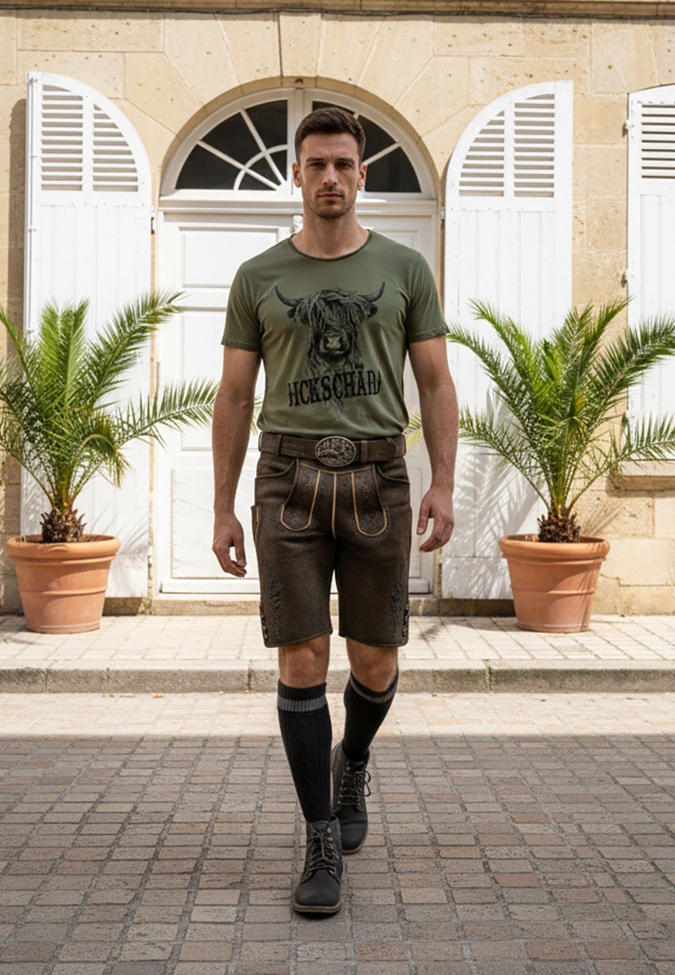 Hangowear T-Shirt "Dickschädel" – lässiger Trachtenstyle mit Charakter. Dieses olivgrüne T-Shirt von Hangowear vereint modernen Trachtenlook mit einem kräftigen Statement. Der auffällige Frontprint zeigt einen detailverliebten Highland-Stier, dessen markantes Aussehen für Stärke und Eigenwilligkeit steht. Direkt darunter sorgt der freche Schriftzug „Dickschädel“ für Aufmerksamkeit und ein Schmunzeln – perfekt für alle, die zu ihrer sturköpfigen Art stehen. Gefertigt aus weicher Baumwolle bietet das Shirt ein angenehmes Tragegefühl und eine hochwertige Verarbeitung. Der lässige Rundhalsausschnitt mit leichten Used-Details und der moderne, leicht taillierte Schnitt machen dieses T-Shirt zum idealen Begleiter – ob zur Lederhose auf dem Oktoberfest, zur Jeans im Alltag oder beim gemütlichen Zusammensitzen mit Freunden. Mit seinem einzigartigen Design und dem humorvollen Print ist dieses Statement-Shirt ein echtes Must-have für alle, die Trachtenmode neu interpretieren möchten. Ideal für Männer mit Persönlichkeit, Stilbewusstsein und einem Augenzwinkern.