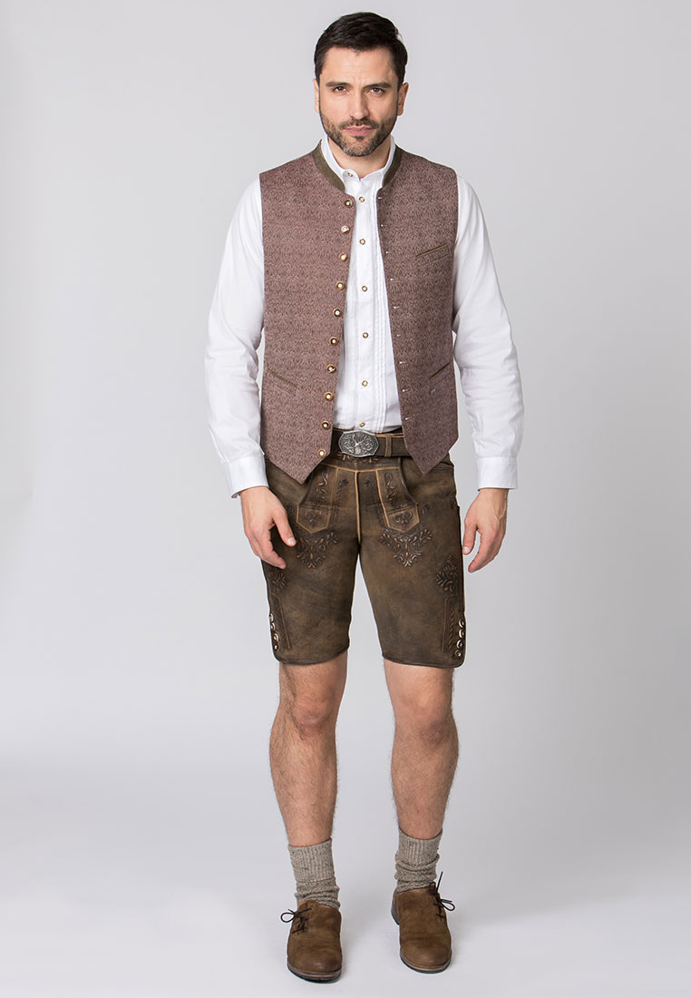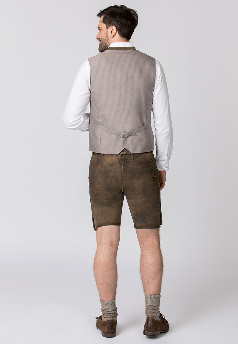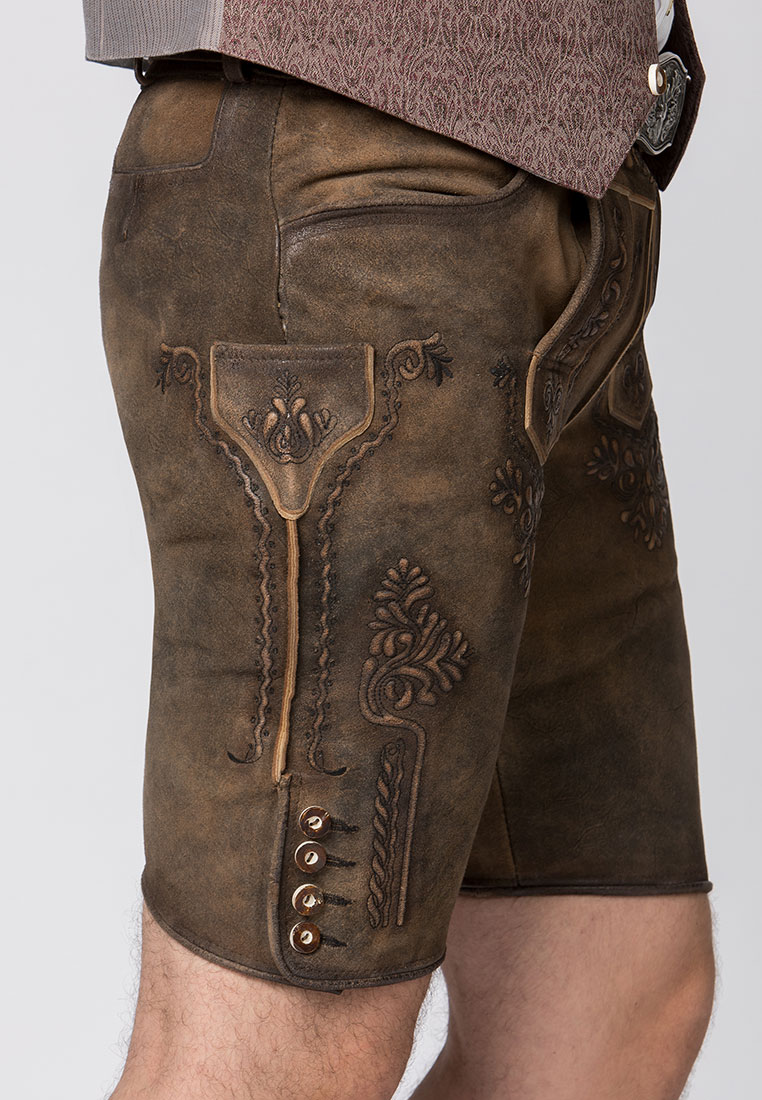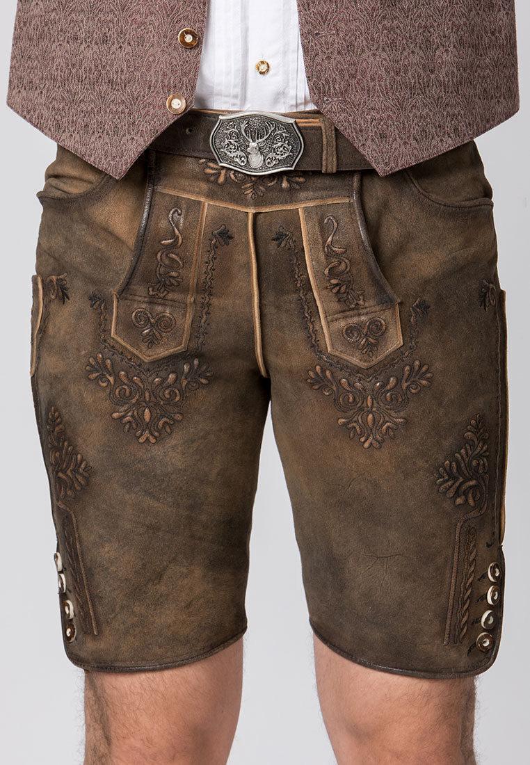 Die kurze Trachtenlederhose Arthur von Stockerpoint Classics. Die Lederhose aus hochwertig gegerbtem Wildbock Leder in Hirschoptik zeichnet sich durch die außergewöhnliche Strukturierung aus und harmoniert perfekt mit den typischen Hornknöpfen. Die traditionelle Stickerei steht dezent im Vordergrund und verleiht dem Modell ihren typischen Charakter. Die Hose wird mit einem passenden Gürtel geliefert und lässt sich zu vielen Trachtenoutfits perfekt kombinieren.