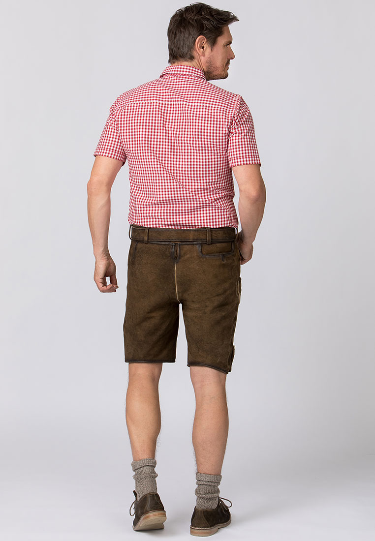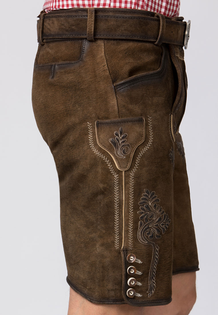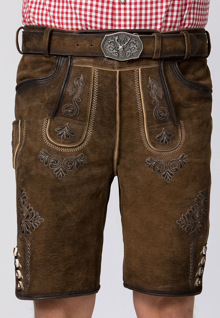 Trachtenlederhose Bertl der Marke Stockerpoint Classics. Die kurze Lederhose aus hochwertig gegerbtem Wildbock Leder in Hirschoptik zeichnet sich durch die aussergewöhnliche Strukturierung aus und harmoniert perfekt mit den klassischen Hornknöpfen. Die traditionelle Stickerei steht dezent im Vordergrund und verleiht dem Modell ihren typischen Charakter. Die Hose wird mit einem Gürtel und einem Gurt mit Hirschmotiv in altsilber geliefert. Sie ist ein Allrounder und lässt sich zu vielen Trachtenoutfits perfekt kombinieren.