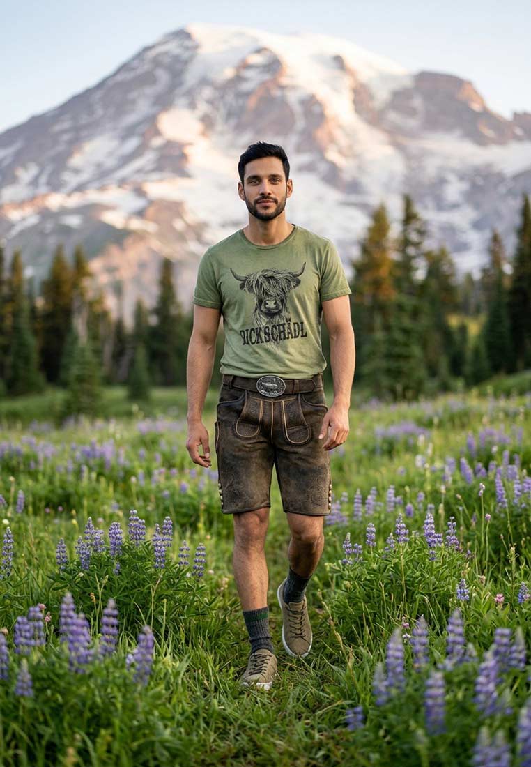 Die knielange Lederhose Achim von Gamsbock ist aus echtem Rindsleder gefertigt und überzeugt mit aufwendigen Stickereien, klassischem Latz und rustikalem Hellbraun mit Antik-Finish. Der traditionelle Look wird durch die seitliche Messertasche und die massive Gürtelschnalle mit Hirschmotiv abgerundet. Dank weichem Leder bietet sie hohen Tragekomfort – perfekt für Volksfeste, Schlagerpartys oder das Oktoberfest.