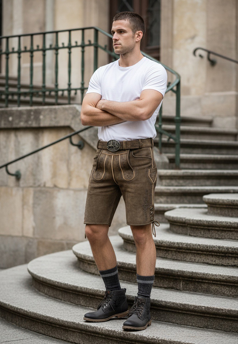 Die Lederhose Ederer in Smoke Antik steht für echte Tradition mit einem markanten, gealterten Look. Aus hochwertigem Rindsleder gefertigt, überzeugt sie mit klassischen Stickereien, seitlicher Schnürung und einem rustikalen Finish. Der authentische Farbton verleiht der Hose Charakter und macht sie zum idealen Begleiter fürs Oktoberfest oder jede Trachtenveranstaltung.
