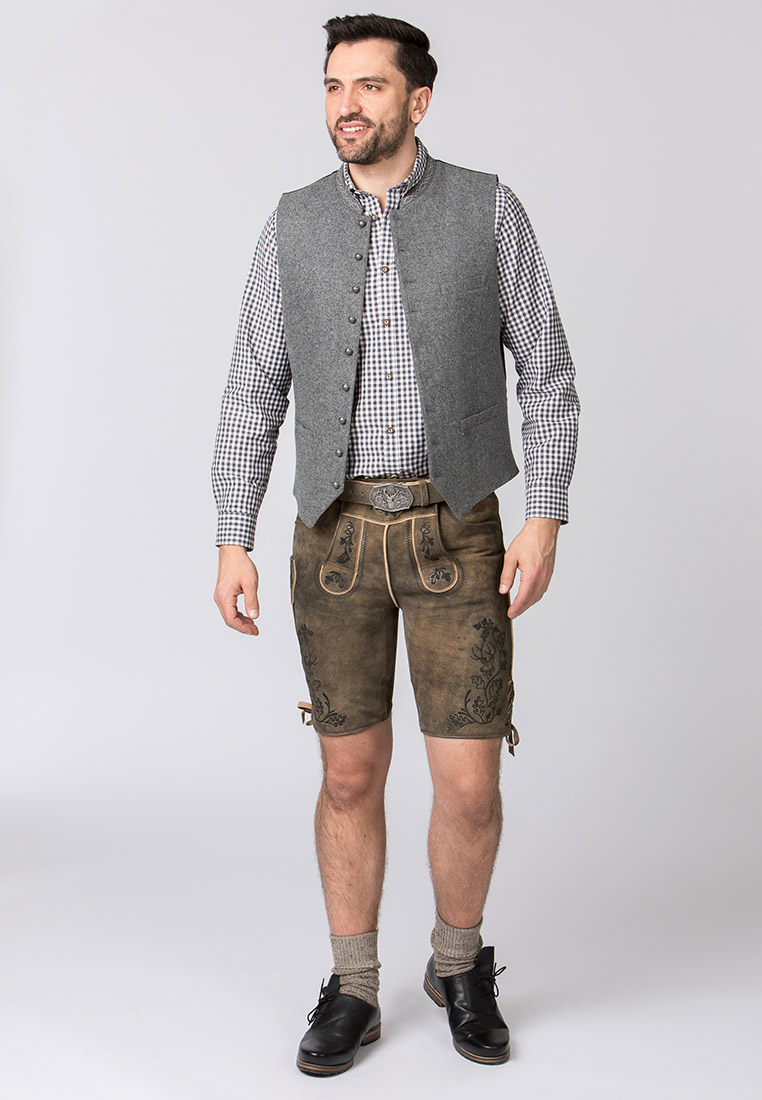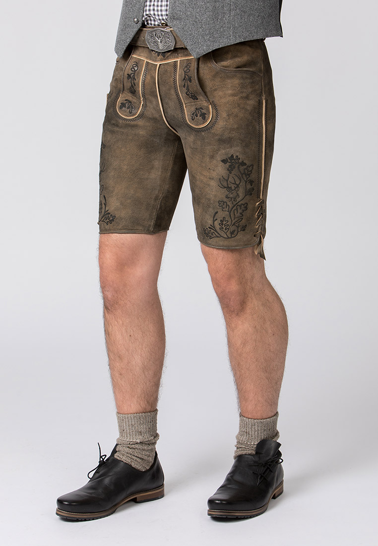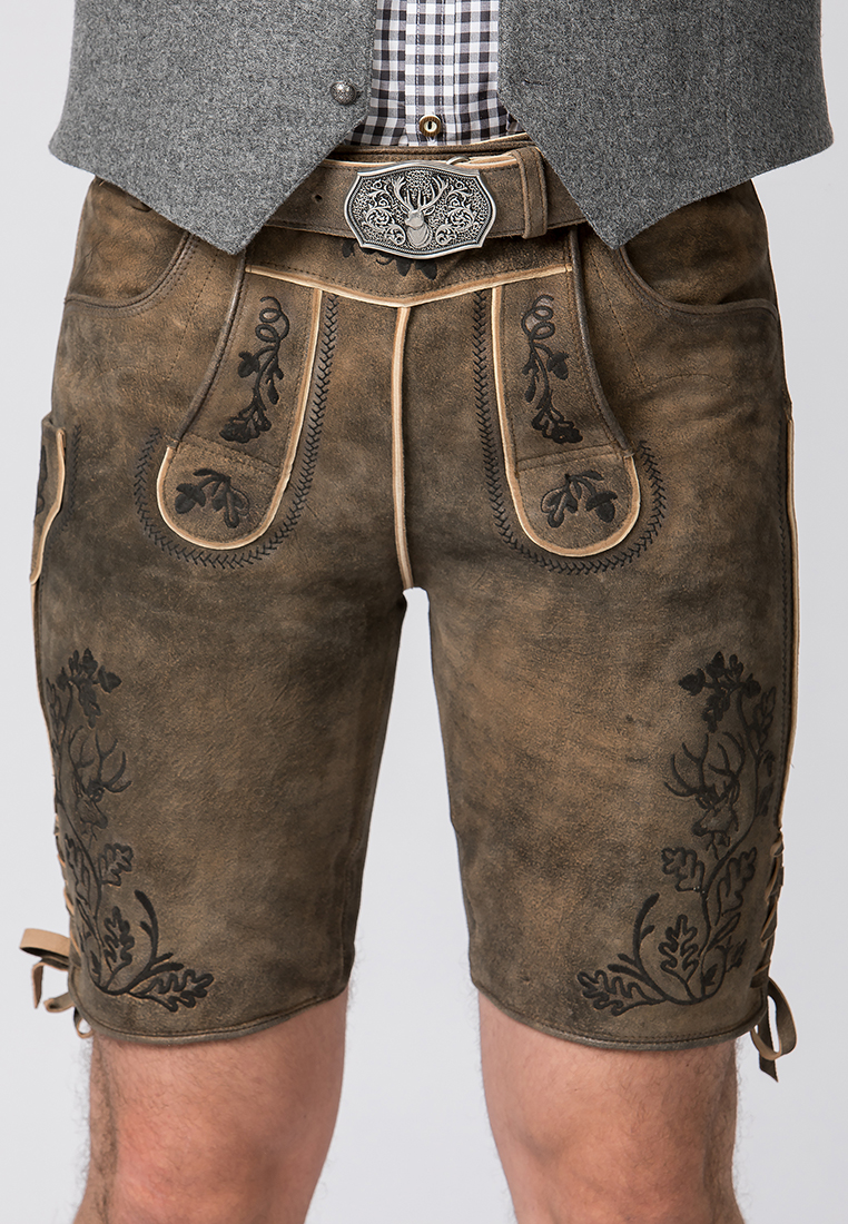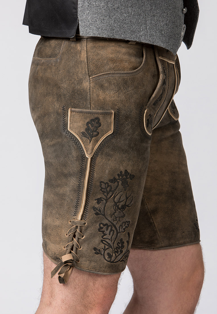 Herren Trachten Lederhose mit antiken Farbverläufen der Marke Stockerpoint. Die traditionelle Stickerei nach alten Vorbildern ist harmonisch abgestimmt und harmoniert perfekt mit den Knöpfen in Hirschhorn-Optik. Der schwarze Stick ist modern und sieht besonders cool aus in Kombination mit einem schwarzen Hemd, einer schwarzen Trachtenweste oder einem coolen Herren Trachtenshirt. Dank Schnürung an Bund-Rückseite und wertigem Lederband am Beinabschluss kann die Lederhose in der Weite angepasst werden. Die Hose wird mit Gürtel geliefert. Finde deinen perfekt abgestimmten Trachtenlook und kombiniere die tolle Lederhose mit Hemd, Weste und Janker.