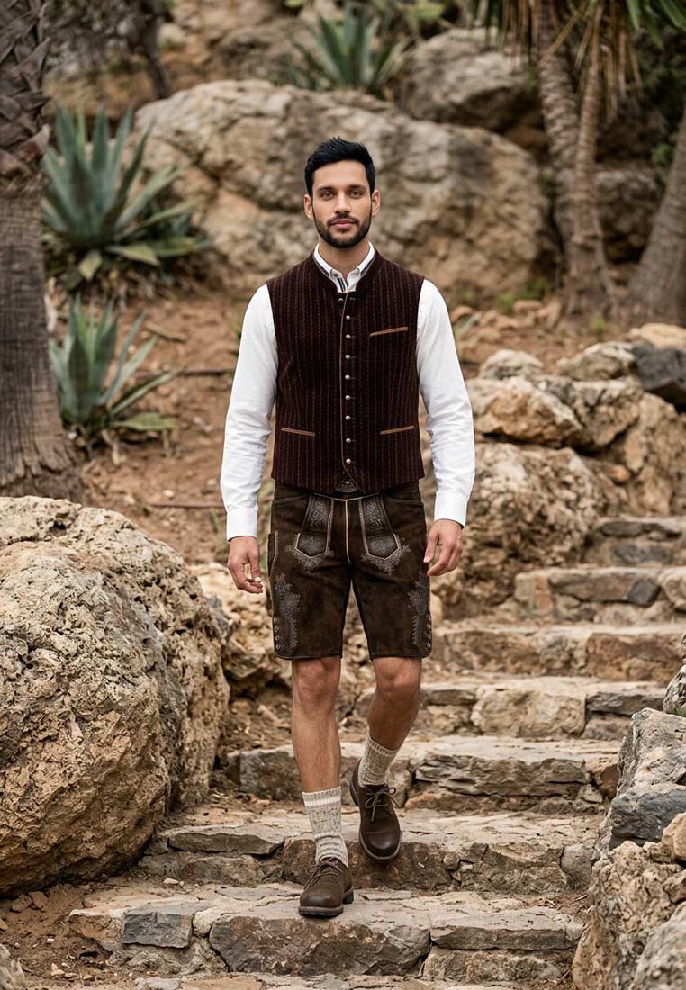 Die Maddox Lederhose Rolli nuss steht für pure Tradition und rustikalen Charme. Hergestellt aus hochwertigem, kräftigem Ziegenleder überzeugt sie mit ihrem satten Nussbraun und dem authentischen Antik-Finish. Die detailreichen Stickereien in heller Kontrastfarbe entlang des Latzes und der Hosenbeine verleihen der Hose einen traditionellen, handwerklichen Look – perfekt für Trachtenliebhaber, die Wert auf Stil und Qualität legen.Ein aufwendig verzierter Gürtel mit alpenländischer Schnalle sowie rustikale Hornoptik-Knöpfe an Bein und Latz ergänzen das Gesamtbild. Die Lederhose Rolli nuss ist dein zuverlässiger Begleiter auf dem Oktoberfest, beim Volksfest oder zu feierlichen Anlässen – robust, bequem und optisch ein echtes Highlight.