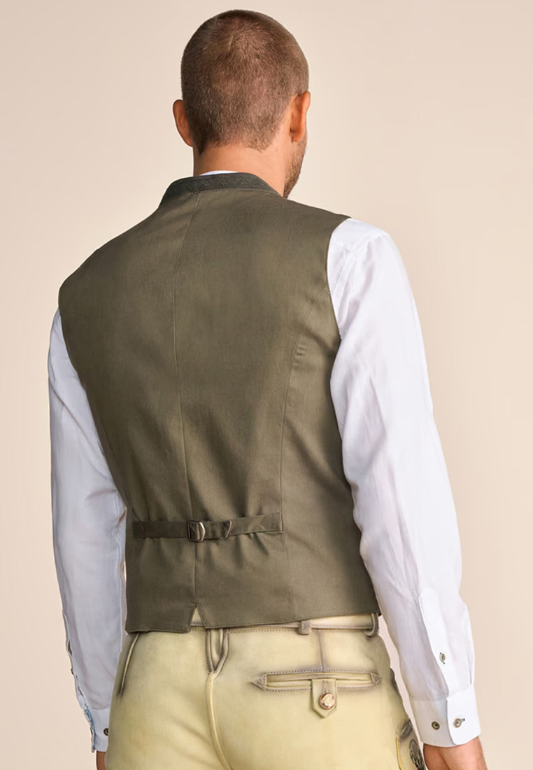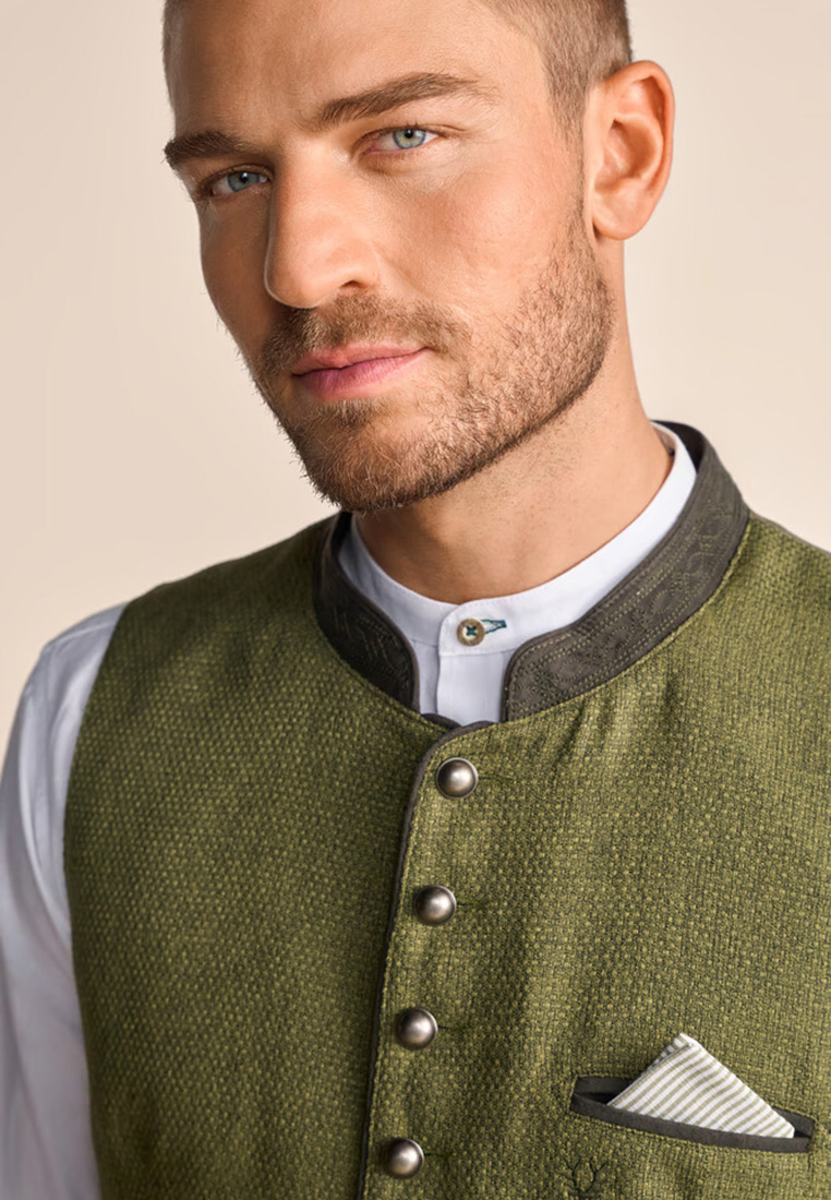 Unsere Trachtenweste Jörn kombiniert auf elegante Art und Weise einen zeitlosen und modernen Look. Die Weste wirkt raffiniert durch den Rundhalsausschnitt und die klassische Knopfleiste mit edlen Knöpfen. Am Kragen werden mit feinen Stickereien geschmackvolle Akzente gesetzt. Die Trachtenweste Jörn eignet sich aufgrund ihrer zeitlosen und modernen Optik hervorragend als Kombinationspartner. Ideal für feierliche Gelegenheiten oder auch als stilvolles Piece im Alltag.