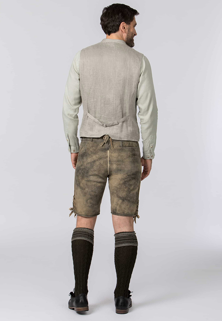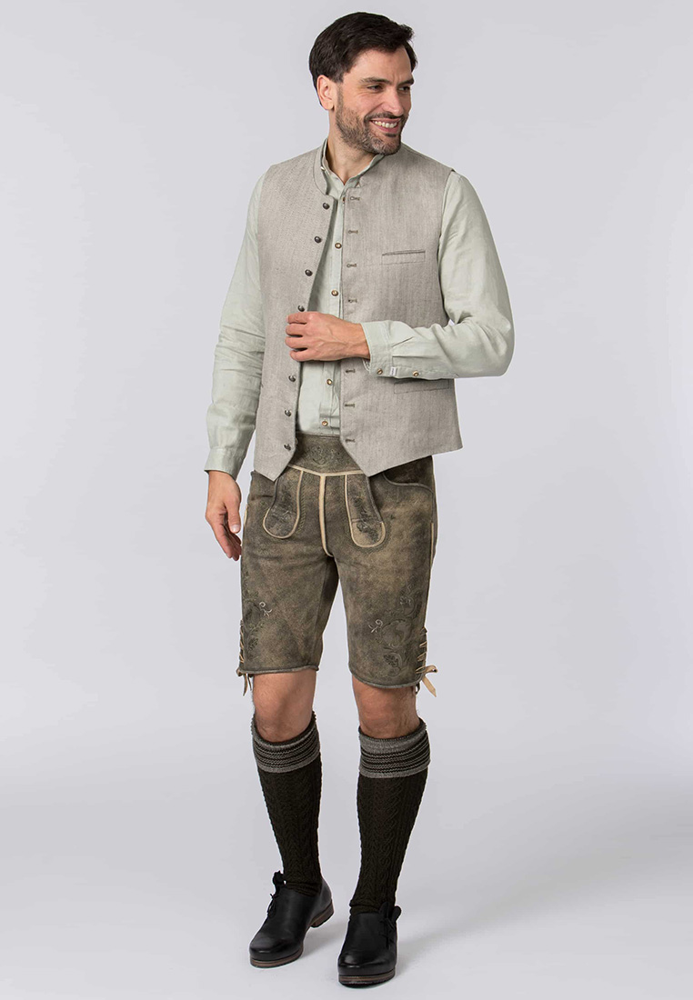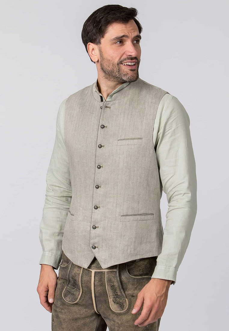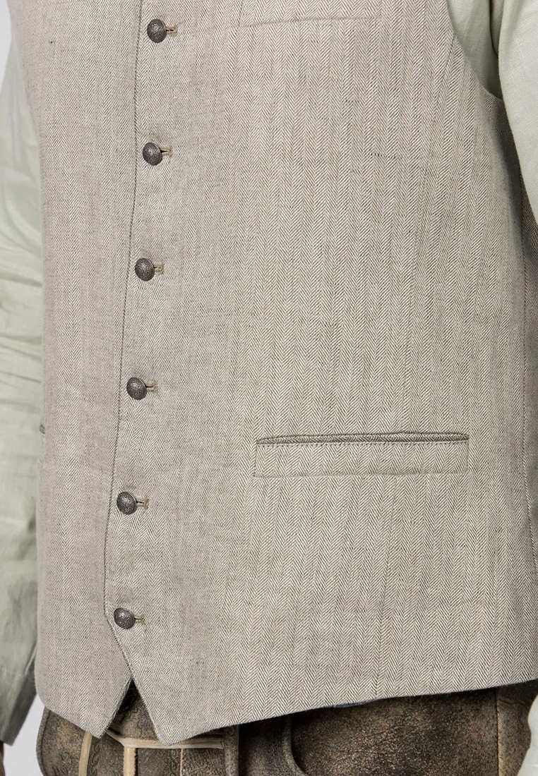 Die Trachtenweste Luzio von Stockerpoint Classics überzeugt mit ihrem klassischen Design und hochwertigen Details. Der feine Leinenstoff mit edlem Fischgrat-Muster in Olive, Indigo oder Graphit verleiht der Weste eine stilvolle und zugleich traditionelle Optik. Dank des sommerlichen Leinenmaterials ist die Weste besonders angenehm zu tragen. Der Stehkragen unterstreicht den authentischen Trachtenstil und macht die Weste zum idealen Begleiter für festliche Anlässe. Geprägte Metallknöpfe in Antikoptik setzen stilvolle Akzente und runden das Design harmonisch ab. Eine praktische Innentasche bietet zusätzlichen Stauraum für kleine Essentials. Das Rückenteil ist mit einem verstellbaren Riegel ausgestattet, um eine optimale Passform zu gewährleisten. Ob klassisch zur Lederhose oder modern mit Jeans kombiniert – die Weste Luzio ist ein vielseitiges Must-have für stilbewusste Trachtenliebhaber.