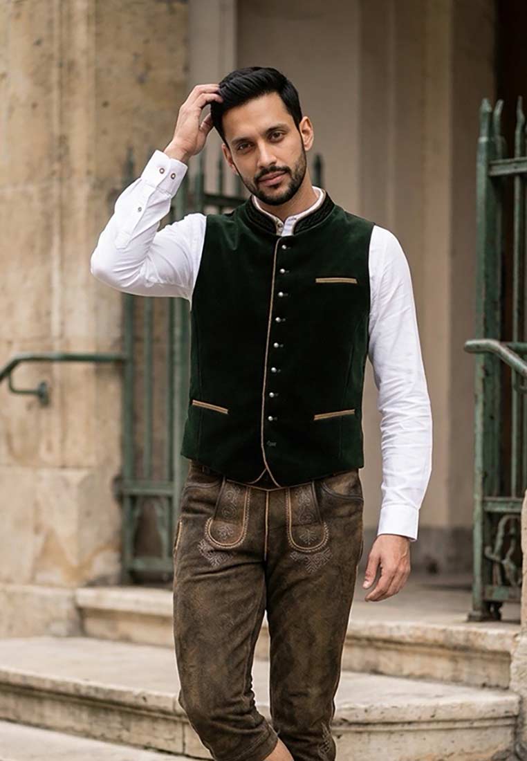 Trachtenweste Ricardo von Stockerpoint Classics. Die klassische Weste aus hochwertigem Baumwollsamt ist der Klassiker unter den Trachtenwesten. Die klassische, gerade Schnittführung garantiert eine sehr gute Passform und einen angenehmen Tragekomfort. Farblich abgestimmter Stehkragen und Paspel unterstreichen das traditionelle Design. Der Rücken ist aus schwarzem Satinstoff und lässt sich mit einem Riegel verstellen. Kugelknöpfe aus altsilber runden das edle Erscheinungsbild gekonnt ab. Die Trachtenweste ist der ideale Kombipartner zu unseren traditionellen Trachtenhemden und Lederhosen.
