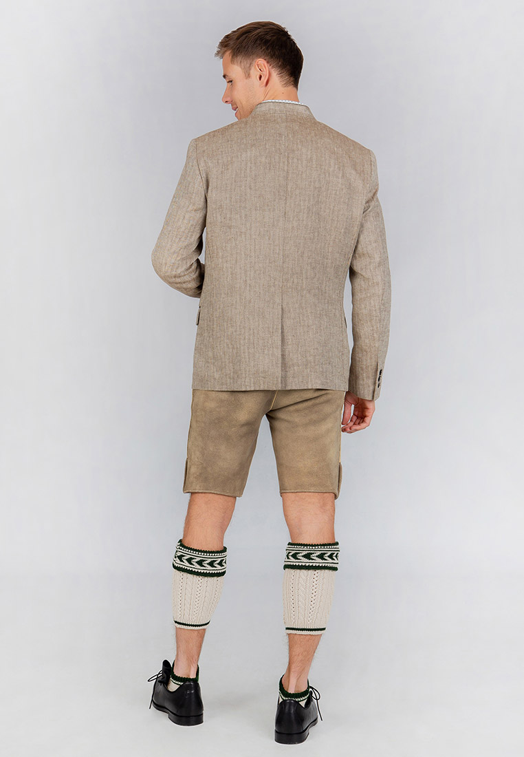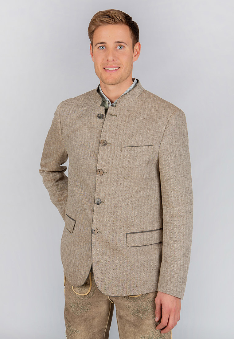 Trachtensakko Gustavo von Stockerpoint/Bergfeuer in nuss. Der traditionelle Trachtenjanker ist aus einem hochwertigen, melierten Leinen in Fischgrät-Optik gefertigt. Die klassische, gerade Schnittführung garantiert eine sehr gute Passform und einen angenehmen Tragekomfort. Farblich abgestimmter Stehkragen und Paspel unterstreichen das markante Design. Rustikale Hornknöpfe runden das edle Erscheinungsbild gekonnt ab. Das Sakko ist der ideale Kombipartner zu unseren Trachtenwesten und prägen den klassischen Trachtenlook.