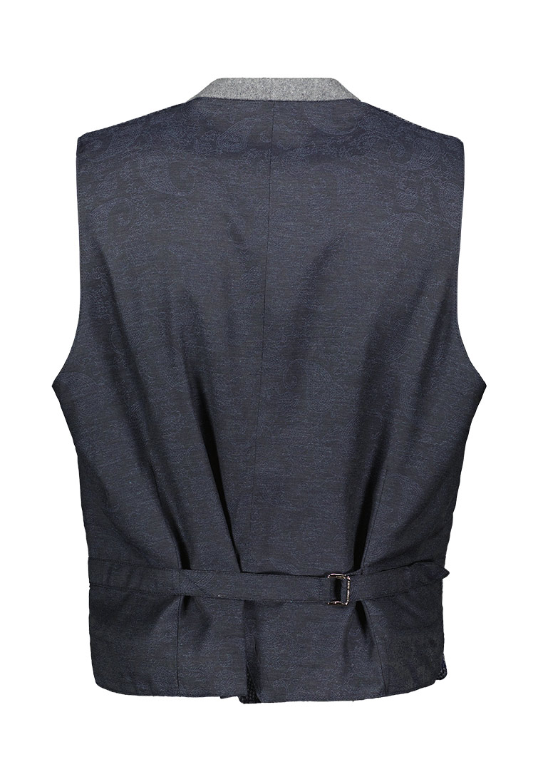 Die Weste verfügt über einen V-Ausschnitt, der den Halsbereich sanft umspielt und das Gesamtbild der Weste besonders schmeichelhaft macht. Der graue Kragen der Weste bildet einen wunderbaren Kontrast zum Blau und verleiht dem Ganzen eine moderne Note.