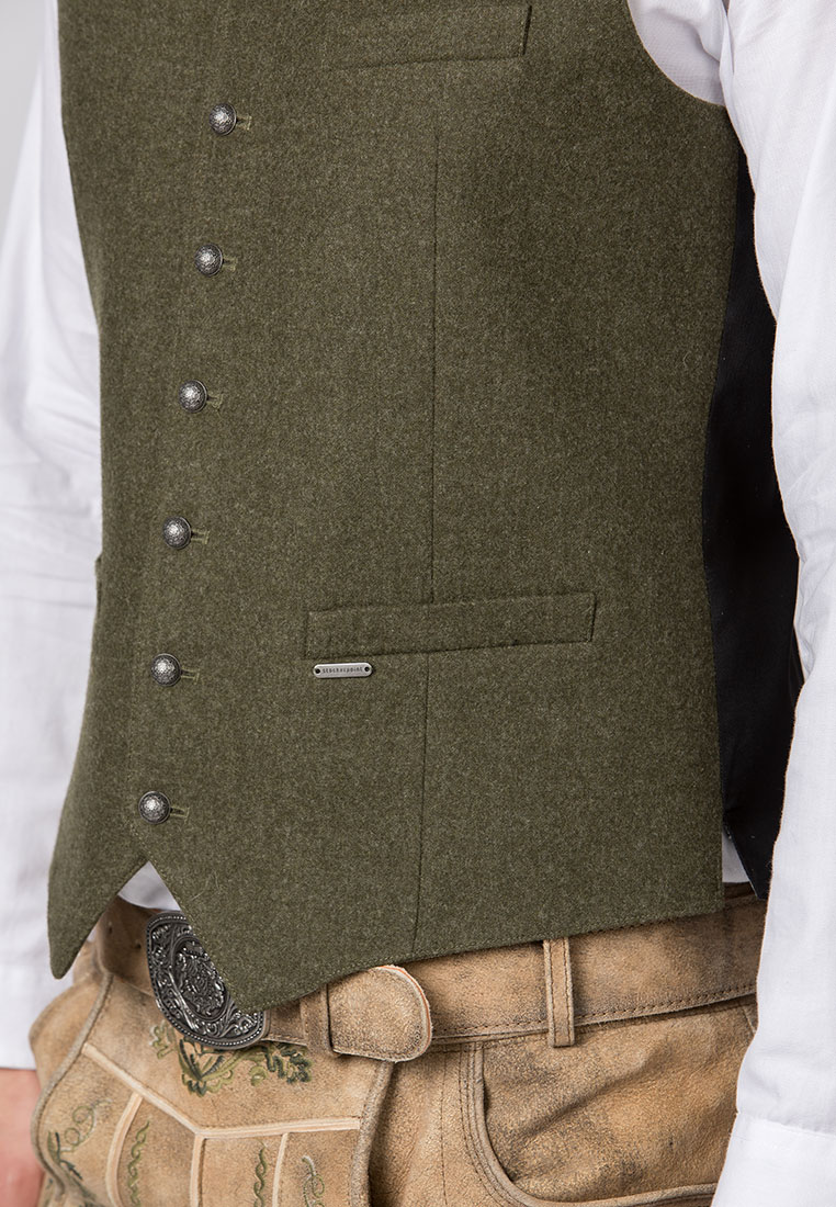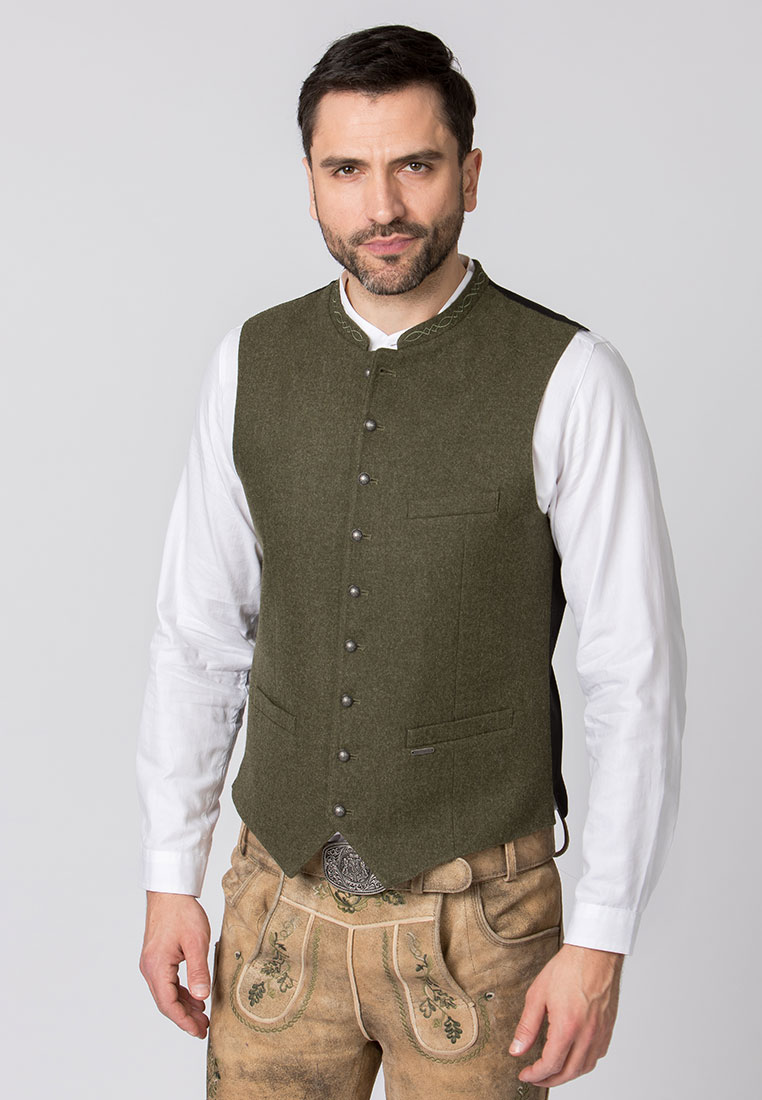 Trachtenweste Devito von Stockerpoint Classics. Die traditionelle Weste ist aus einer hochwertigen melierten Lodenqualität gefertigt. Die klassische, gerade Schnittführung garantiert eine sehr gute Passform und einen angenehmen Tragekomfort. Harmonisch abgestimmter, bestickter Stehkragen und Paspel unterstreichen das besondere Design. Der Rücken ist aus einem exklusiven, schwarzen Baumwollstoff gefertigt und lässt sich mit einem Riegel verstellen. Kugelknöpfe in altsilber runden das edle Erscheinungsbild gekonnt ab. Die Trachtenweste ist der ideale Kombipartner zu unseren Lederhosen und Trachtenwesten und prägen den klassischen Trachtenlook.