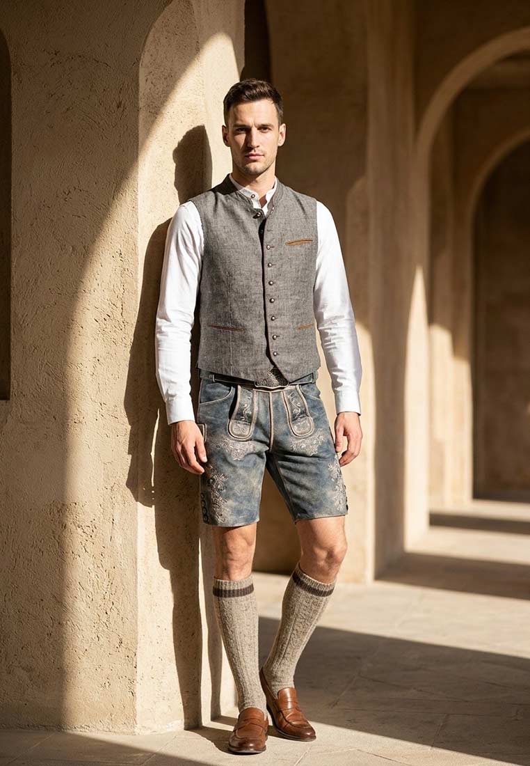 Die Trachtenweste Brixen von Kaiseralm ist eine stilvolle Weste mit einem traditionellen und eleganten Design. Die Vorderseite der Weste ist in blau/grau gehalten und die Rückseite ist in einem anthrazitfarbenen, dezent gemusterten Stoff gefertigt. Die Weste ist mit zierlichen Knöpfen verziert, die den Trachten-Look vervollständigen. Die Weste verfügt über eine Brusttasche und zwei Taschen an den Seiten, die praktisch sind und gleichzeitig das Design der Weste abrunden. Die hochwertigen Materialien und die sorgfältige Verarbeitung machen diese Trachtenweste zu einem langlebigen und vielseitigen Kleidungsstück, das zu vielen Gelegenheiten wie Oktoberfest, Schlagerfest oder an eine Hochzeit getragen werden kann.