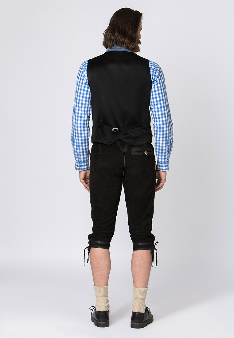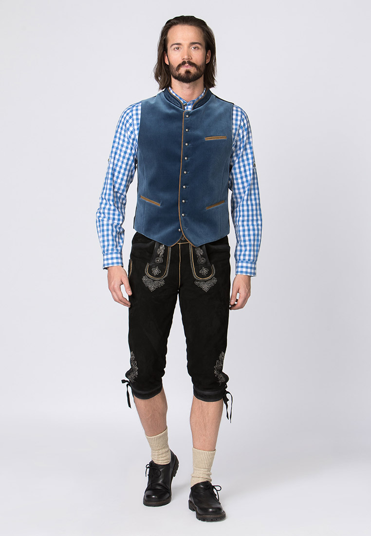 Trachtenweste Ricardo von Stockerpoint Classics in trendigem rauchblau. Die klassische Weste aus hochwertigem Baumwollsamt ist der Klassiker unter den Trachtenwesten. Die klassische, gerade Schnittführung garantiert eine sehr gute Passform und einen angenehmen Tragekomfort. Farblich abgestimmter Stehkragen und Paspel unterstreichen das traditionelle Design. Der Rücken ist aus schwarzem Satinstoff und lässt sich mit einem Riegel verstellen. Kugelknöpfe aus altsilber runden das edle Erscheinungsbild gekonnt ab. Die Trachtenweste ist der ideale Kombipartner zu unseren traditionellen Trachtenhemden und Lederhosen.