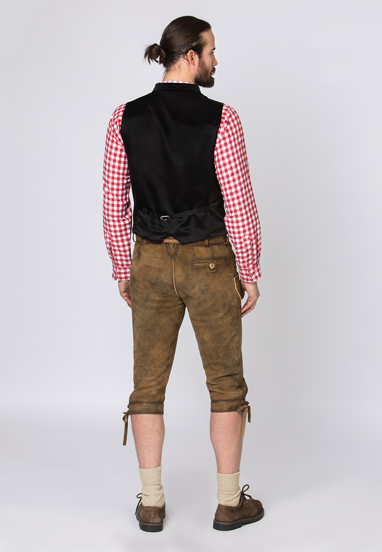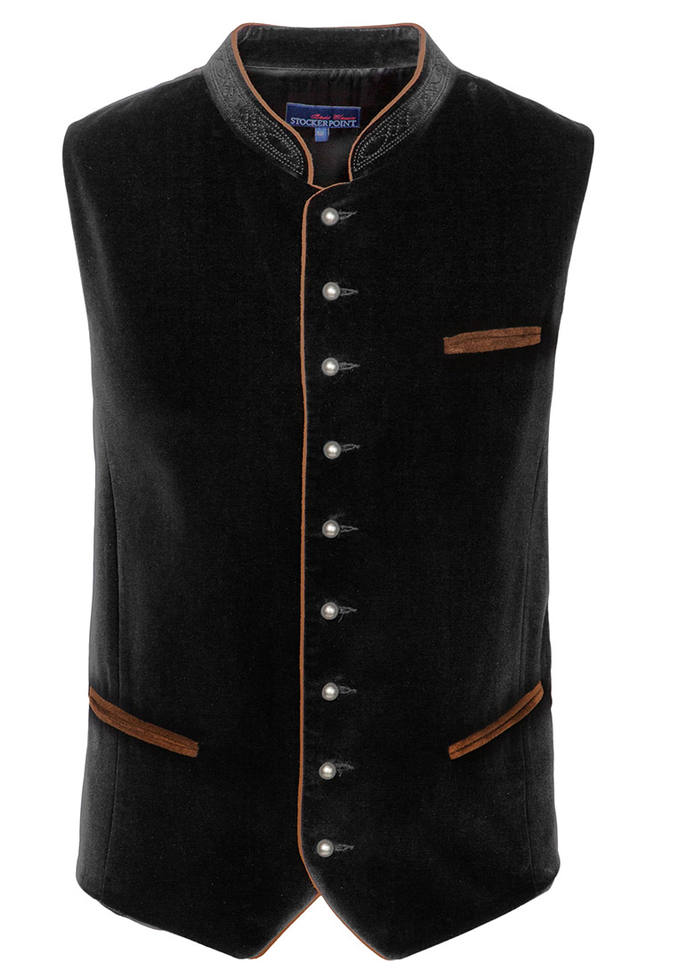 Die Trachtenweste Ricardo von Stockerpoint Classics in Schwarz ist ein zeitloser Klassiker aus edlem Baumwollsamt. Mit ihrem geradlinigen Schnitt bietet sie eine hervorragende Passform und angenehmen Tragekomfort. Der farblich abgestimmte Stehkragen sowie die dezenten Paspeln betonen das traditionelle Design. Der Rücken besteht aus schwarzem Satinstoff und kann mit einem verstellbaren Riegel angepasst werden. Edle Kugelknöpfe in Altsilber vervollständigen das stilvolle Erscheinungsbild. Diese Weste lässt sich perfekt mit verschiedenen Trachtenhemden und Lederhosen aus unserem Sortiment kombinieren.