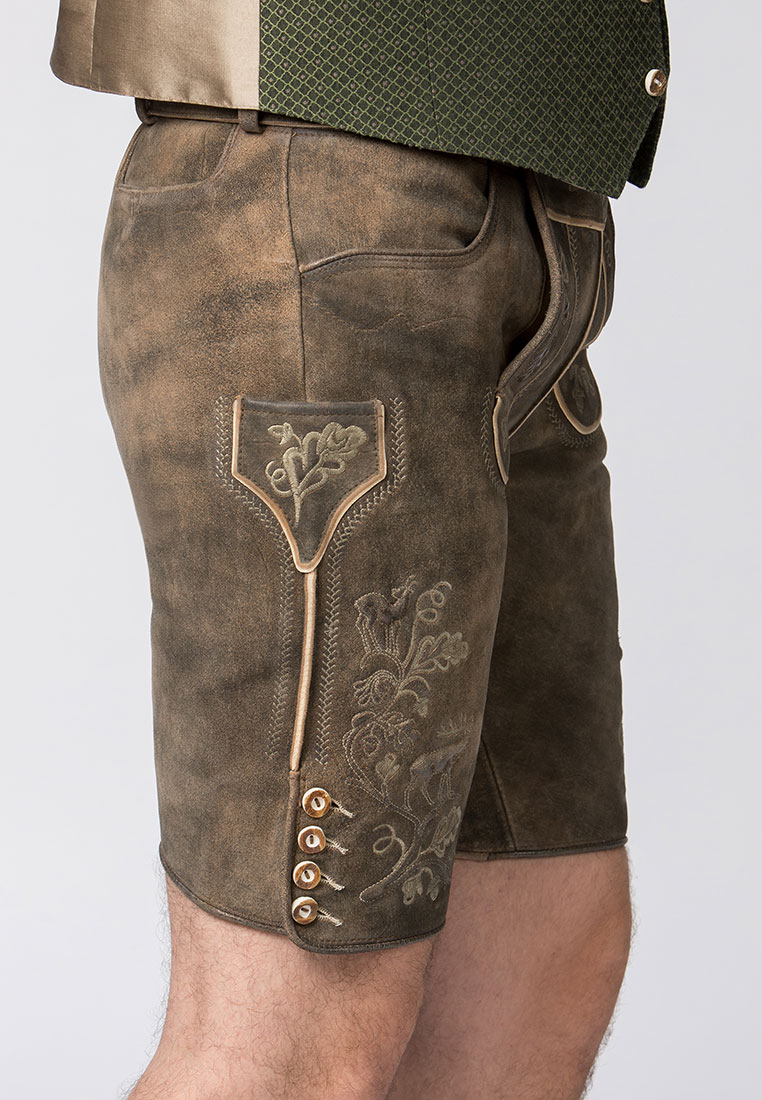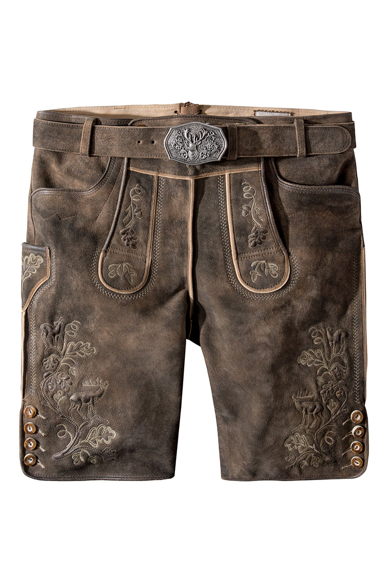 Trachtenlederhose Bastian von Stockerpoint Classics. Die kurze Lederhose aus hochwertig gegerbten Wildbock Leder in Hirschoptik ist in Design und Qualität auf Zeitlosigkeit und Langlebigkeit ausgelegt. Das Modell wird mit traditionellen Eichenlaub- und Hirschmotiven Motiven liebevoll bestickt. Die Trachtenhose wird nach alten Vorbildern gefertigt und mit viel Herzblut von Hand gespeckt. Dadurch entsteht der typische, trendige Vintage Look. Die Lederhose wird mit einem Gürtel mit Hirschmotiv in altsilber geliefert. Sie lässt sich wunderbar zu deinem Lieblingsoutfit kombinieren.