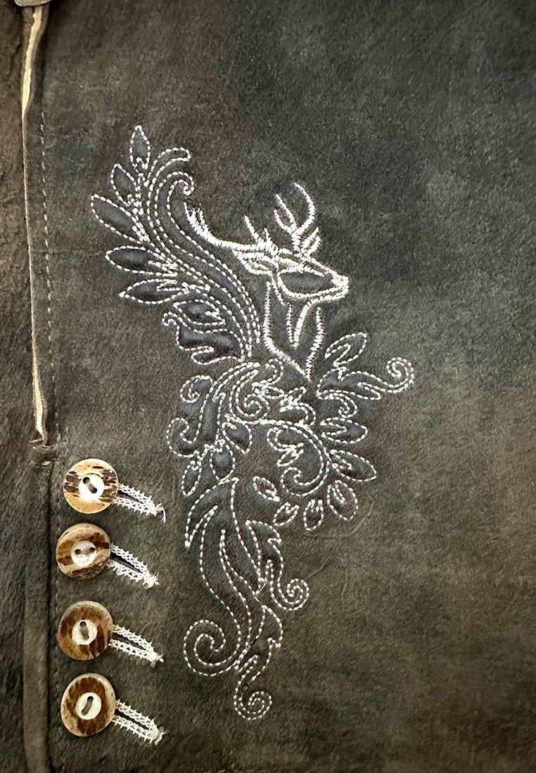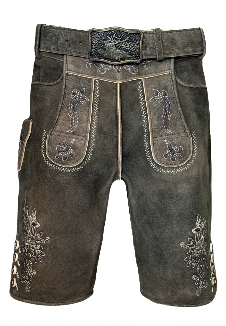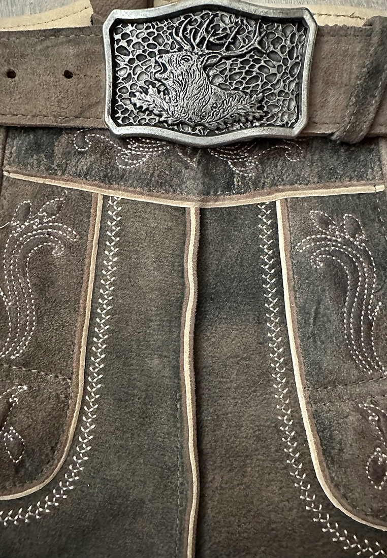 Egal ob du das Oktoberfest in München besuchst, das Frühlingsfest zelebrierst oder einfach eine traditionelle Feierlichkeit geniessen möchtest - die Lederhose Boris ist die perfekte Wahl für einen authentischen und stilvollen Auftritt. Die Lederhose ist mit 4 Hirschhornknöpfen entlang der Seiten des Hosenbeins verziert, was nicht nur traditionell ist, sondern auch einen charmanten Akzent setzt. Der mitgelieferte Gürtel ist mit einer kunstvoll verzierten Schnalle versehen, die das Gesamtbild stilvoll abrundet.
