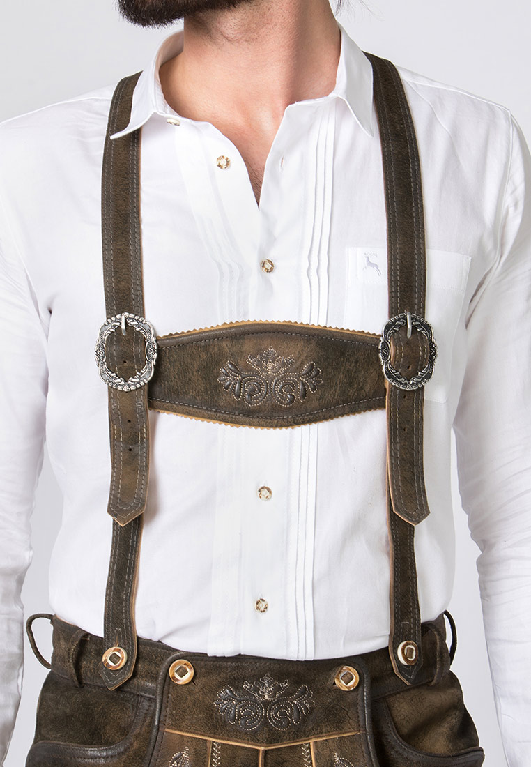 Trachtenlederhose Justin von Stockerpoint Classics. Die Kniebund Lederhose aus hochwertig gegerbtem Wildbock Leder in Hirschoptik zeichnet sich durch die außergewöhnliche Strukturierung aus und harmoniert perfekt mit den klassischen Hornknöpfen. Sie ist die am meisten gekaufte Kniebundhose. Die traditionelle Stickerei steht dezent im Vordergrund und verleiht dem Modell ihren typischen Charakter. Durch die Schnürung am Bund und am Beinabschluss lässt sie sich individuell verstellen und dem Körper genau anpassen. Die Hose wird mit einem passenden H-Träger geliefert. Sie ist ein Allrounder und lässt sich zu vielen traditionellen Trachtenoutfits perfekt kombinieren.