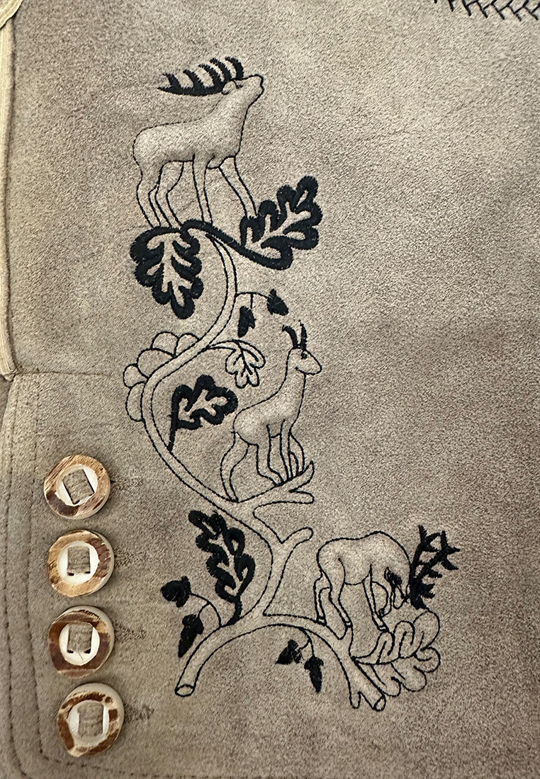 Die Lederhose Kochelsee sand von Maddox vereint traditionelles Design mit hochwertiger Handwerkskunst. Hergestellt aus feinstem Ziegenleder, überzeugt sie mit einer angenehm weichen Haptik und einem authentischen Vintage-Finish. Die natürliche Sandfarbe mit sanften Used-Effekten verleiht der Hose einen rustikalen und zugleich edlen Charakter. Detailreiche Stickereien in hellen Naturtönen zieren die Latzpartie sowie die Beinpartien und unterstreichen den traditionellen Trachtenstil. Die kunstvollen Eichenlaub- und Hirschmotive verleihen der Hose eine besondere Note. Ein weiteres Highlight ist der integrierte Gürtel mit einer markanten Metallschließe, die mit einem aufwendigen Wappenmotiv verziert ist. Die Schnürung am Beinabschluss sorgt für eine perfekte Passform und setzt einen stilvollen Akzent. Ob für das Oktoberfest, Hochzeiten oder traditionelle Trachtenfeste – die Lederhose Kochelsee lässt sich ideal mit einem klassischen Trachtenhemd, einer edlen Weste oder rustikalen Haferlschuhen kombinieren. Mit ihrem einzigartigen Design und der exzellenten Verarbeitung ist sie ein echtes Must-have für anspruchsvolle Trachtenliebhaber.