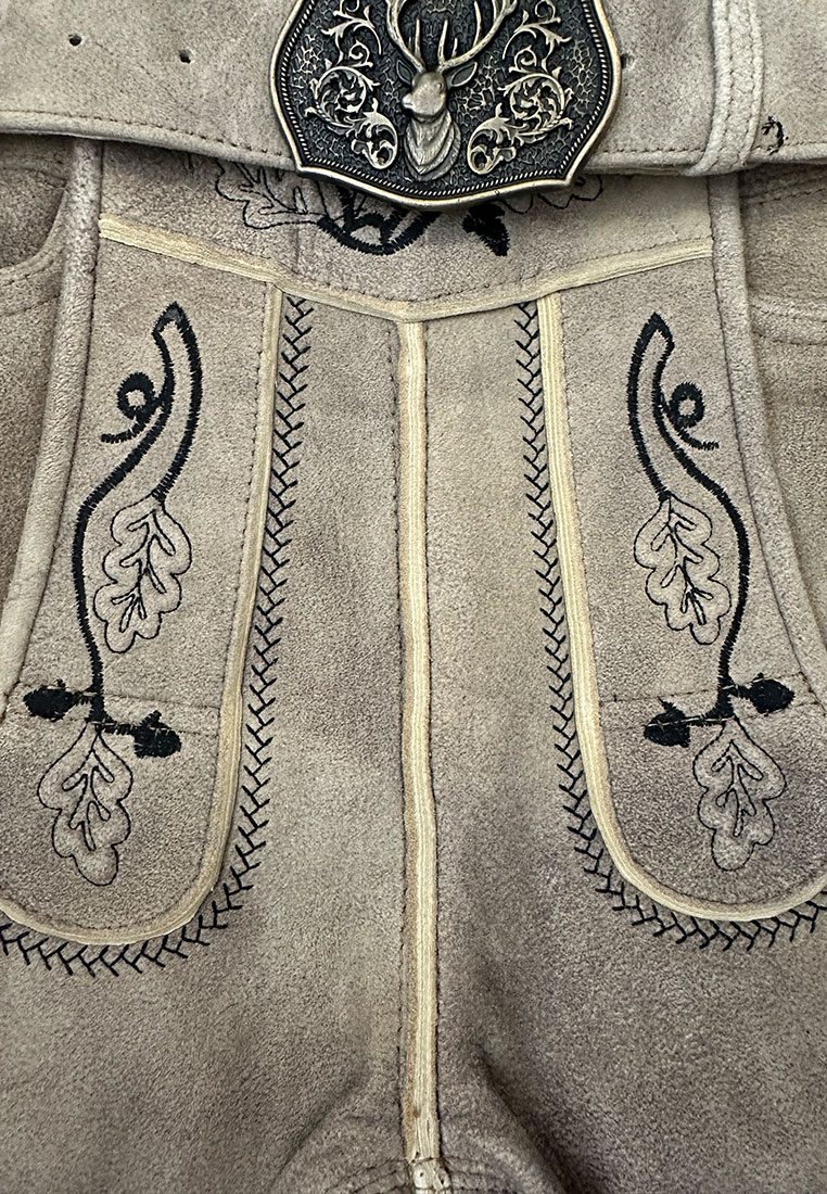 Egal ob du das Oktoberfest in München besuchst, das Frühlingsfest zelebrierst oder einfach eine traditionelle Feierlichkeit geniessen möchtest - die Lederhose Boris ist die perfekte Wahl für einen authentischen und stilvollen Auftritt. Die Lederhose ist mit 4 Hirschhornknöpfen entlang der Seiten des Hosenbeins verziert, was nicht nur traditionell ist, sondern auch einen charmanten Akzent setzt. Der mitgelieferte Gürtel ist mit einer kunstvoll verzierten Schnalle versehen, die das Gesamtbild stilvoll abrundet.