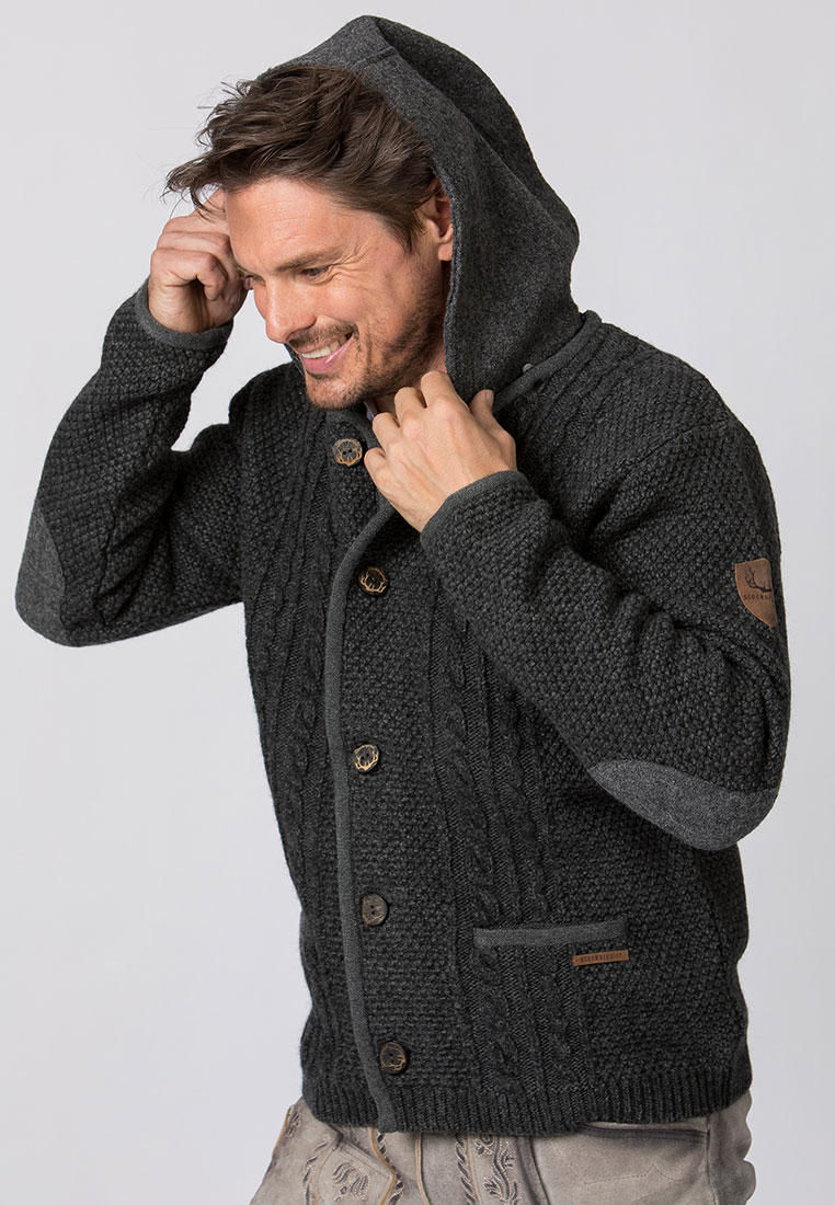 Trachten-Strickjacke Milan von Stockerpoint Classics. Die Kapuzenjacke erhält durch die melierte, hochwertige Wollmischung traditionelle Akzente. Die rustikale, markante Strickoptik mit Zopfmuster und die abnehmbare Lodenkapuze runden das Gesamtbild gekonnt ab. Hochwertige Ärmel-Patches und rustikale Hornknöpfe setzen eine klassische Note. Die Eingriffstaschen und die Kanten sind harmonisch mit einem kontrastigen Lodenstoff abgesetzt. Die klassische, gerade Schnittführung garantiert eine sehr gute Passform und einen angenehmen Tragekomfort. Der modische Hoodie begeistert zur traditionellen Lederhose ebenso wie zur Jeans.