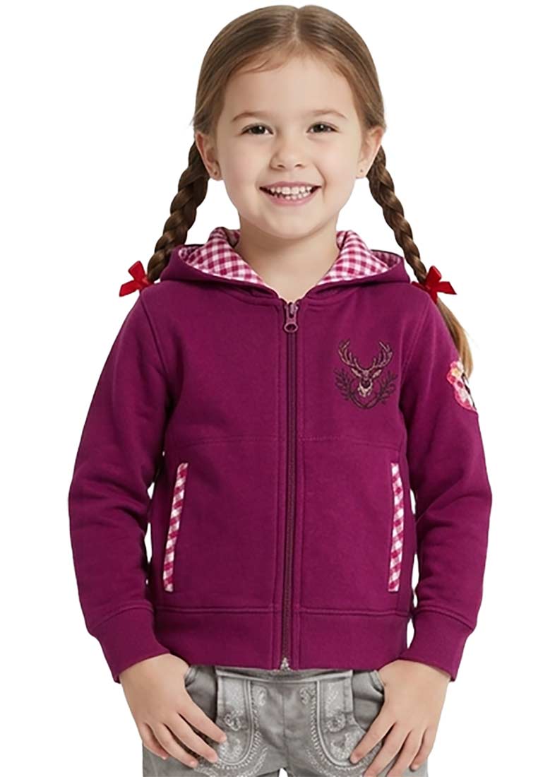 Trendige Trachtenjacke für jede Wiesnprinzessin. Der rosa karierte Innenstoff in der Kapuze und den beiden Taschen lassen jedes Mädchenauge leuchten.