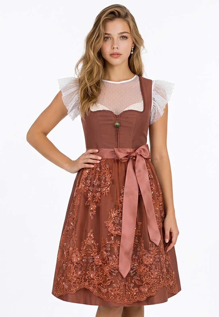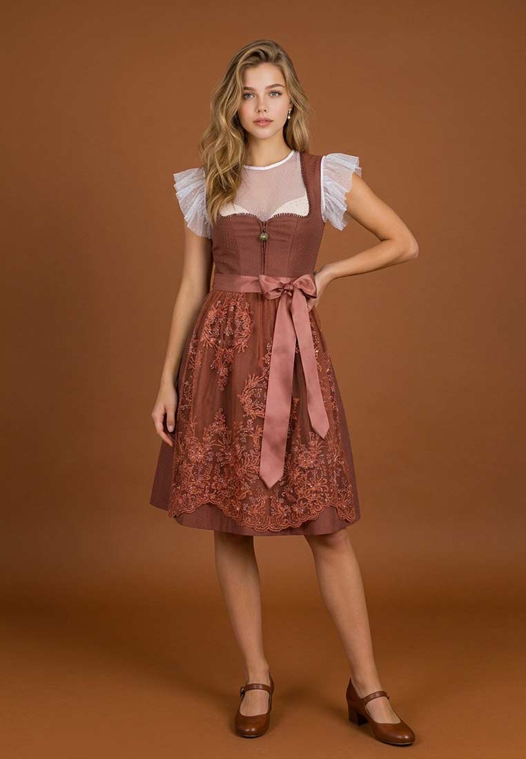 Entdecke die zeitlose Eleganz und die warmen Herbsttöne des Dirndl Thiersheim Siena! Dieses bezaubernde Dirndl von Marjo Trachten ist eine Hommage an die Schönheit der Natur und verkörpert eine elegante und naturnahe Ästhetik. Mit einer Rocklänge von 58 cm präsentiert sich dieses Dirndl in einer eleganten, ton-in-ton Herbstfarbe, die perfekt zur Jahreszeit passt und eine natürliche Verbundenheit ausstrahlt. Ein mittig angebrachter Reissverschluss an der Vorderseite ermöglicht ein einfaches An- und Ausziehen, während dezente Verzierungen das Dekolleté schmücken und dem Dirndl einen Hauch von Raffinesse verleihen. Die Spitzenschürze, Ton in Ton zum Kleid, ist mit funkelnden Glitzerpailletten verziert, die dem Outfit einen Hauch von Glamour verleihen. Eine seidig glänzende Schleife rundet das Gesamtbild ab und verleiht dem Dirndl einen femininen Touch. Bitte beachte, dass eine Dirndlbluse nicht im Preis inbegriffen ist. Doch keine Sorge! In unserem umfangreichen Sortiment findest du eine Vielzahl von Blusen, die perfekt zu diesem wunderschönen Dirndl passen und es ermöglichen, deinen persönlichen Stil zu unterstreichen. Das Dirndl Thiersheim Siena eignet sich perfekt für verschiedene Anlässe, von traditionellen Oktoberfesten bis hin zu eleganten Herbstfesten und gesellschaftlichen Veranstaltungen. Trage es mit Stolz und geniesse die zeitlose Schönheit und Eleganz dieses wundervollen Dirndls!