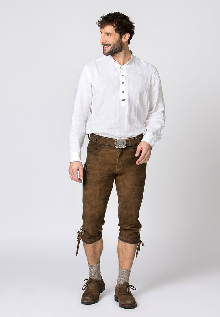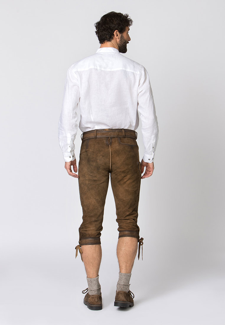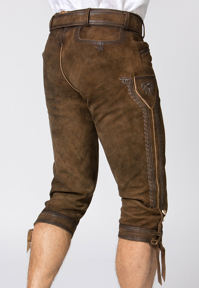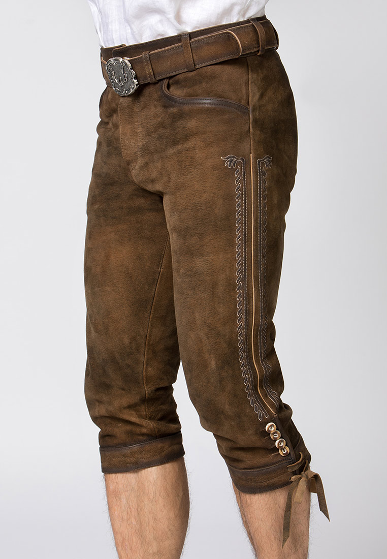 Trachtenlederhose Siggi von Stockerpoint Classics. Die Kniebund Lederhose aus hochwertig gegerbtem Wildbock Leder in Hirschoptik zeichnet sich durch die außergewöhnliche Strukturierung aus und harmoniert perfekt mit den klassischen Hornknöpfen. Statt mit einem Latz wird diese Hose mit Reißverschluss gefertigt. Die traditionelle Stickerei steht dezent im Vordergrund und verleiht dem Modell ihren typischen Charakter. Durch die Schnürung am Bund und am Beinabschluss lässt sie sich individuell verstellen und dem Körper genau anpassen. Die Hose wird mit einem Gürtel und einer Schließe mit Hirschmotiv in altsilber geliefert. Sie ist ein Allrounder und lässt sich zu vielen traditionellen Trachtenoutfits perfekt kombinieren.