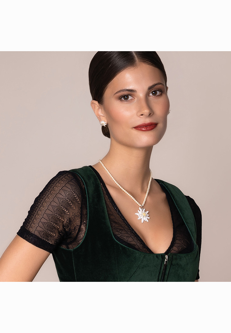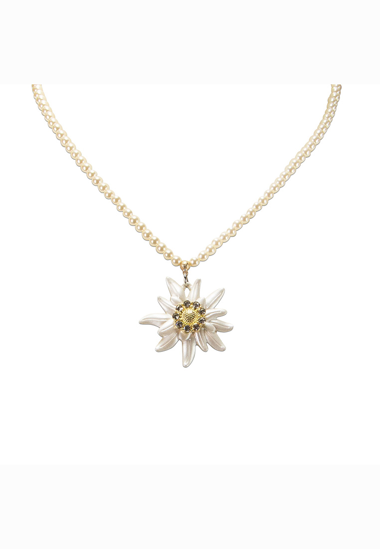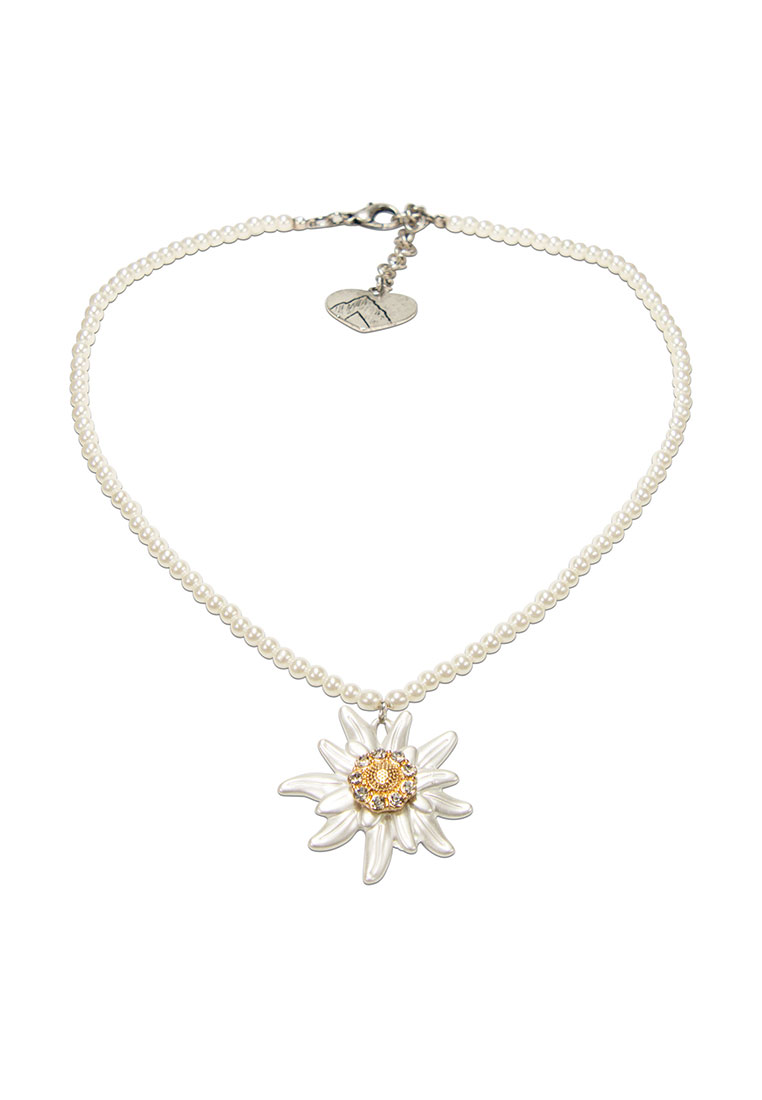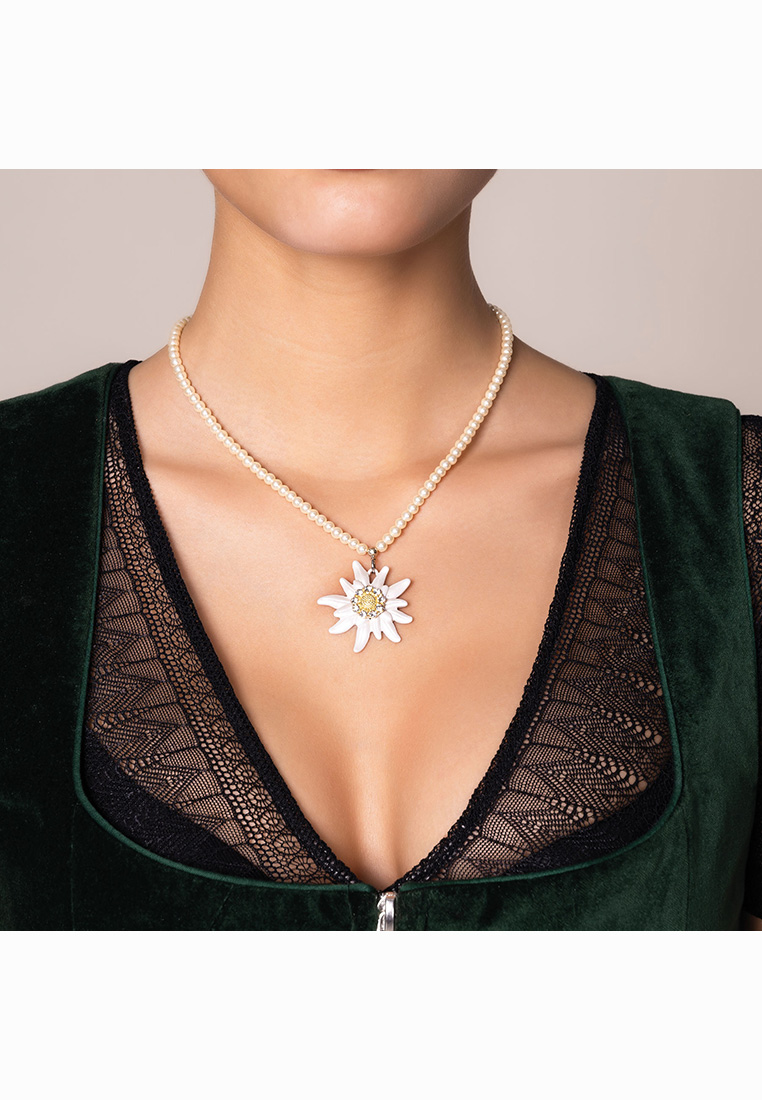 Klassische Edelweiss Halskette passend zur Tracht oder zum traditionellen Trachtenmieder von der Marke Alpenflüstern. Die Perlen-Trachtenhalskette besticht durch ihr bi-color-farbenes Strass-Edelweiss. Die vielen Strass-Steine funkeln und runden das Bild ab. Eine zeitlose Trachtenkette und passend zu jedem Dirndl. Länge Trachten Halskette: ca. 42 cm + 5 cm Verlängerungs-Kette, Edelweiss-Anhänger bicolor-farben mit Strass-Steinen: ca. 3,7 x 3,7 cm. Wunderschöner Dirndlschmuck aus Wachs-Perlen, Perlenkette von Hand gefertigt, angenehmes Tragegefühl. Trachten-Kette perfekt zum Trachten-Outfit (Dirndl, Lederhose, Trachtenbluse, Oktoberfest)