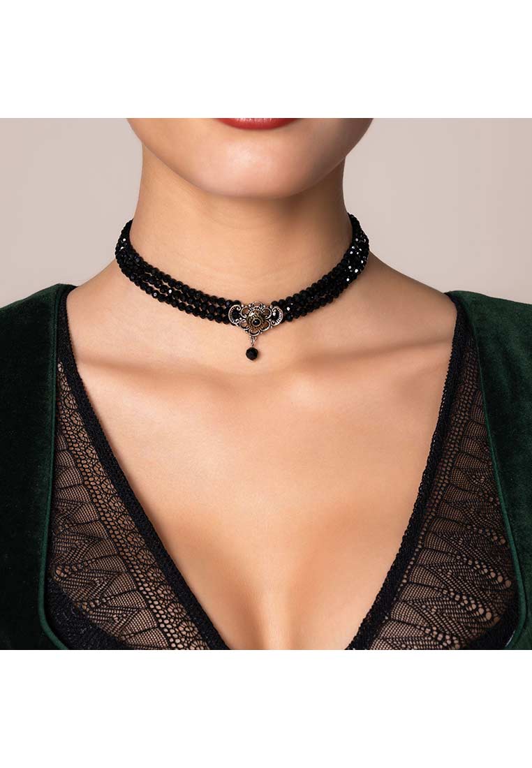 Die Perlenkropfkette Hedwig besteht aus 3 Reihen wunderschöner Perlen. In der Mitte befindet sich ein bicolor-farbenes Schmuckelement, welches die Trachtenkette enorm aufwertet. Die Länge der Kette misst ca. 32 cm + 7 cm Verlängerungs-Kette. Wunderschöner traditioneller Dirndlschmuck aus Perlen, Perlenkette von Hand gefertig.