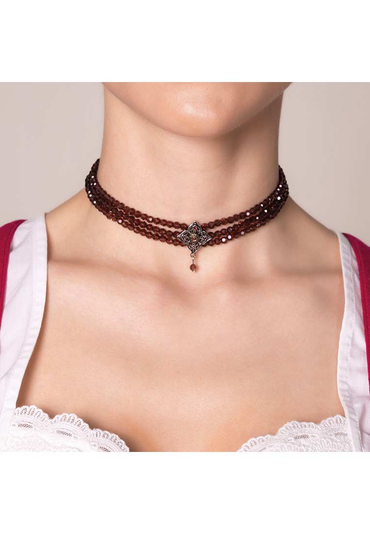 Das Trachten-Perlencollier Louise vereint klassische Tradition mit stilvoller Eleganz und ist ein echtes Schmuckhighlight zur Tracht. Die dreireihige Kette aus hochwertigen, glänzenden Perlen legt sich sanft um den Hals und überzeugt durch ihr angenehm leichtes Tragegefühl. Im Zentrum steht ein detailreich gearbeitetes, bicolorfarbenes Mittelteil in viereckiger Form, das mit funkelnden Steinen und einer feinen Perle veredelt ist und dem Collier eine besonders edle Ausstrahlung verleiht. Mit einer Länge von ca. 32 cm sowie einer zusätzlichen Verlängerungskette von rund 7 cm lässt sich das Collier optimal anpassen und sitzt perfekt zum Dirndl, zur Trachtenbluse oder auch zur Lederhose. Ob Oktoberfest, Hochzeit oder festlicher Anlass, dieses von Hand gefertigte Perlencollier unterstreicht die Verbundenheit zur Tracht und verleiht jedem Outfit eine feminine und hochwertige Note. Gefertigt aus Glas, Zink und Eisen, steht das Trachten-Perlencollier Louise für liebevolle Verarbeitung und zeitlose Schönheit.