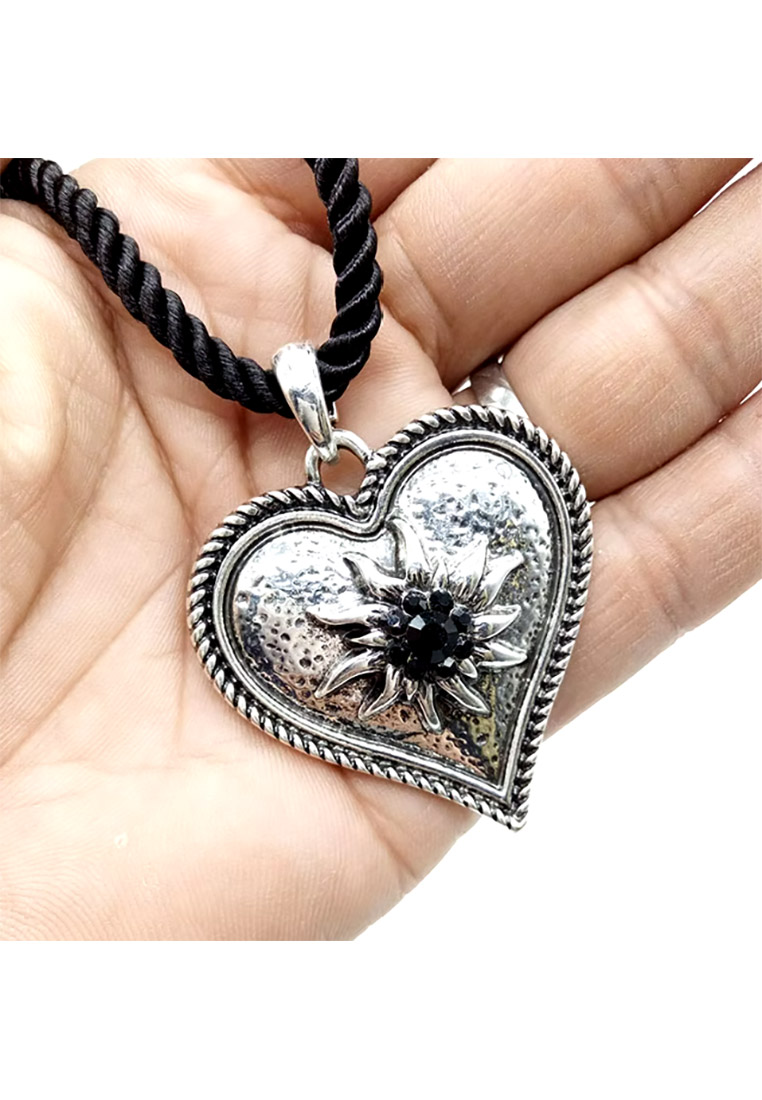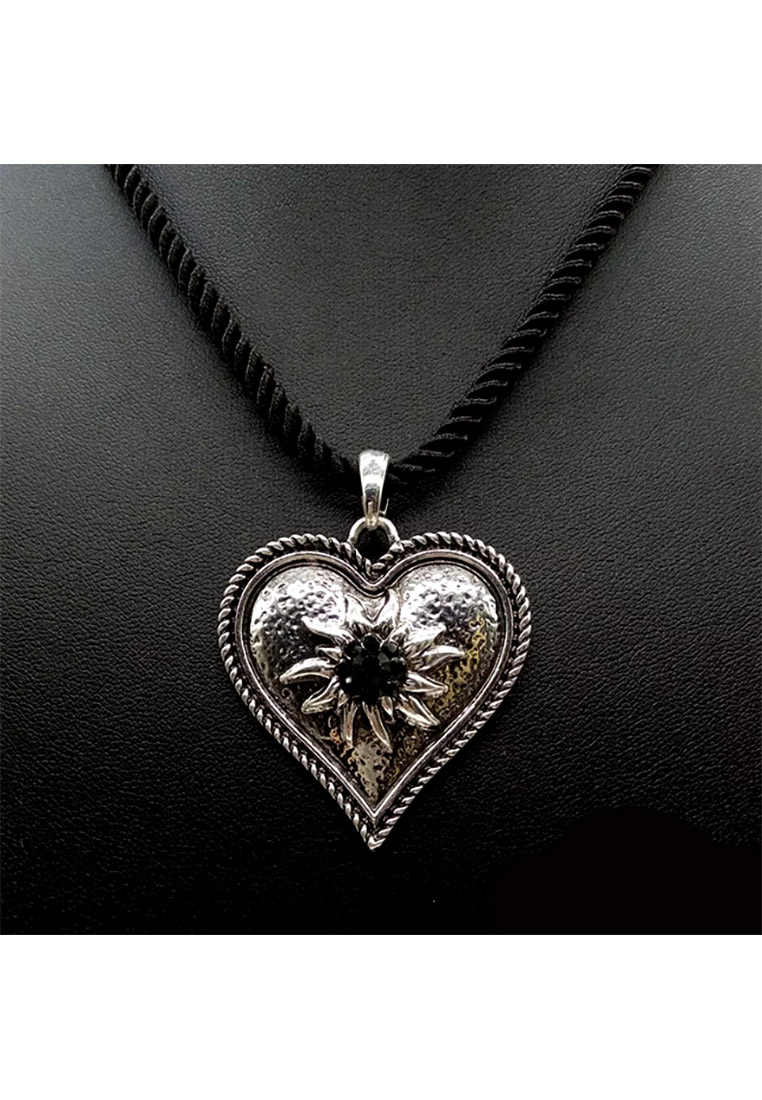Diese elegante Trachtenkette ist das perfekte Accessoire für alle, die ihre Liebe zur Tradition und zum Stil zum Ausdruck bringen möchten. Der hübsche Herzanhänger hat eine Grösse von etwa 4 x 3,5 cm und ist mit funkelnden Steinchen besetzt, die das edle Edelweissmotiv im Herzen zum Strahlen bringen. Das zarte Band ist in einer traditionellen Kordeloptik gehalten und rundet das Design harmonisch ab. Ob zur Frühlingswiesn, zum Oktoberfest oder anderen festlichen Anlässen – dieses Schmuckstück verleiht jedem Dirndl oder Trachtenoutfit den letzten Schliff und sorgt für strahlende Blicke.