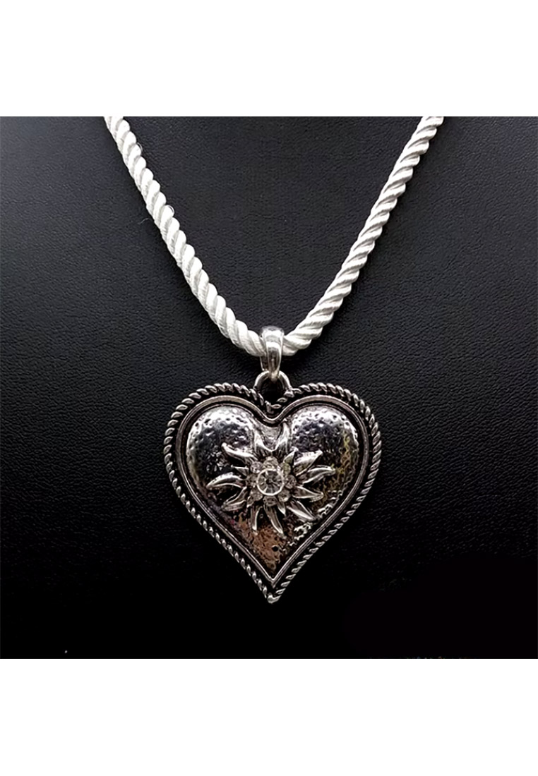 Diese elegante Trachtenkette ist das perfekte Accessoire für alle, die ihre Liebe zur Tradition und zum Stil zum Ausdruck bringen möchten. Der hübsche Herzanhänger hat eine Grösse von etwa 4 x 3,5 cm und ist mit funkelnden Steinchen besetzt, die das edle Edelweissmotiv im Herzen zum Strahlen bringen. Das zarte Band ist in einer traditionellen Kordeloptik gehalten und rundet das Design harmonisch ab. Ob zur Frühlingswiesn, zum Oktoberfest oder anderen festlichen Anlässen – dieses Schmuckstück verleiht jedem Dirndl oder Trachtenoutfit den letzten Schliff und sorgt für strahlende Blicke.