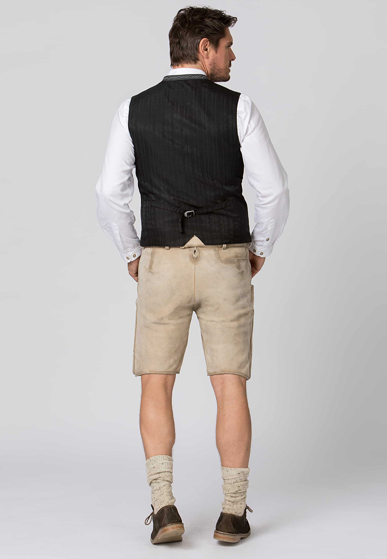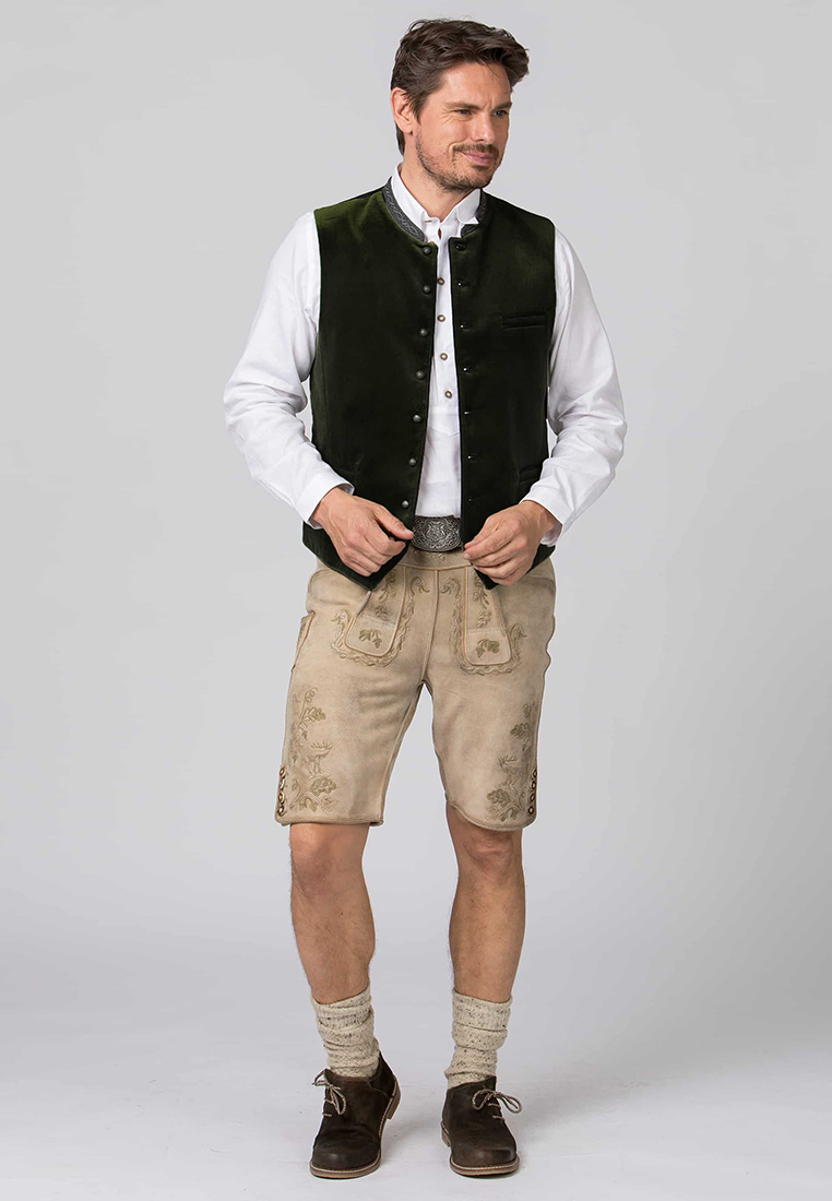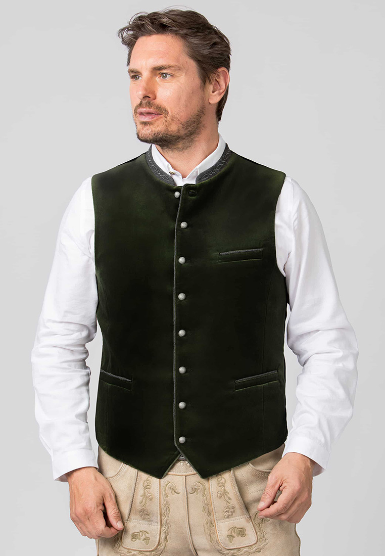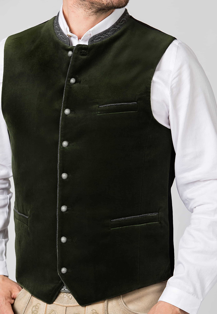 Trachtenweste Lorenzo tanne – Ihre stilvolle Verbindung aus Tradition und zeitloser Eleganz. Die Weste Lorenzo in tiefem Waldgrün ist ein stilvoller Klassiker aus der Stockerpoint Classics Kollektion und bringt traditionelle Eleganz in Ihre Trachten-Garderobe. Gefertigt aus hochwertigem Baumwollsamt, überzeugt sie durch ihren edlen Glanz und eine angenehm weiche Haptik. Der Stehkragen aus dezent besticktem Lodenstoff verleiht der Weste eine authentische Note und hebt sich optisch stilvoll vom Samt ab. Farblich abgestimmte Paspeln betonen die klare Linienführung und unterstreichen das klassische Design. Die geprägten Kugelknöpfe in Altsilber-Optik setzen traditionelle Akzente und runden das Erscheinungsbild gekonnt ab. Dank der geraden Schnittführung sitzt die Trachtenweste bequem und passgenau. Der Rücken aus edlem, schwarz gestreiften Jacquardstoff ist mit einem verstellbaren Riegel ausgestattet, der eine individuelle Anpassung ermöglicht. Ob zur Lederhose beim Festtag oder als stilvoller Akzent zum Hemd im Alltag – die Weste Lorenzo in Waldgrün ist ein vielseitiger Begleiter mit Charakter und Heimatgefühl.
