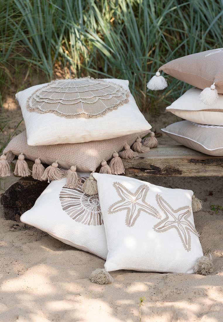 Dieses dekorative Kissen in Creme und Beige mit aufwendig gestalteten Seesternmotiven verleiht jedem Wohnraum eine stilvolle, maritime Note und sorgt für eine warme, natürliche Atmosphäre. Der Bezug aus einer hochwertigen Mischung aus Baumwolle, Leinen und Polyester überzeugt durch seine angenehme Haptik und langlebige Qualität, während die detailreiche Applikation und die dekorativen Quasten an den Ecken dem Kissen einen besonderen, handwerklichen Charakter verleihen. Mit einer Grösse von ca. 45 × 45 cm eignet es sich ideal als Blickfang auf Sofa, Bett oder Sessel und lässt sich wunderbar mit hellen Farben, Naturmaterialien und modernen Wohnkonzepten kombinieren. Das Kissen ist für den Innenbereich vorgesehen und sollte chemisch gereinigt werden, damit Form und Material lange erhalten bleiben.