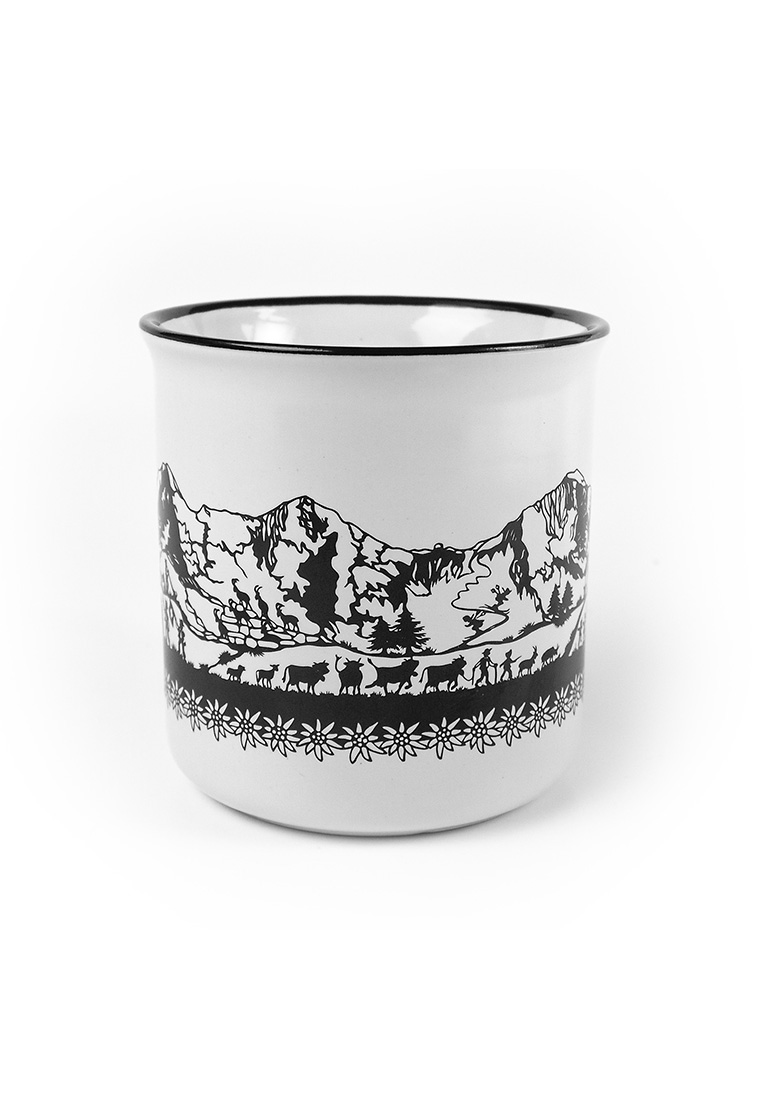 Hochwertige Keramiktasse im Swiss Style, die nicht nur durch Kratzfestigkeit sowie Scheuerbeständigkeit glänzt. Spülmaschinenfest ist sie sowieso. Scherenschnitt by Esther Gerber. Höhe 93mm. Passend für die Wohnung oder Chalet in den Bergen oder für alle die stolz darauf sind in der Schweiz zu leben und die Tradition feiern.