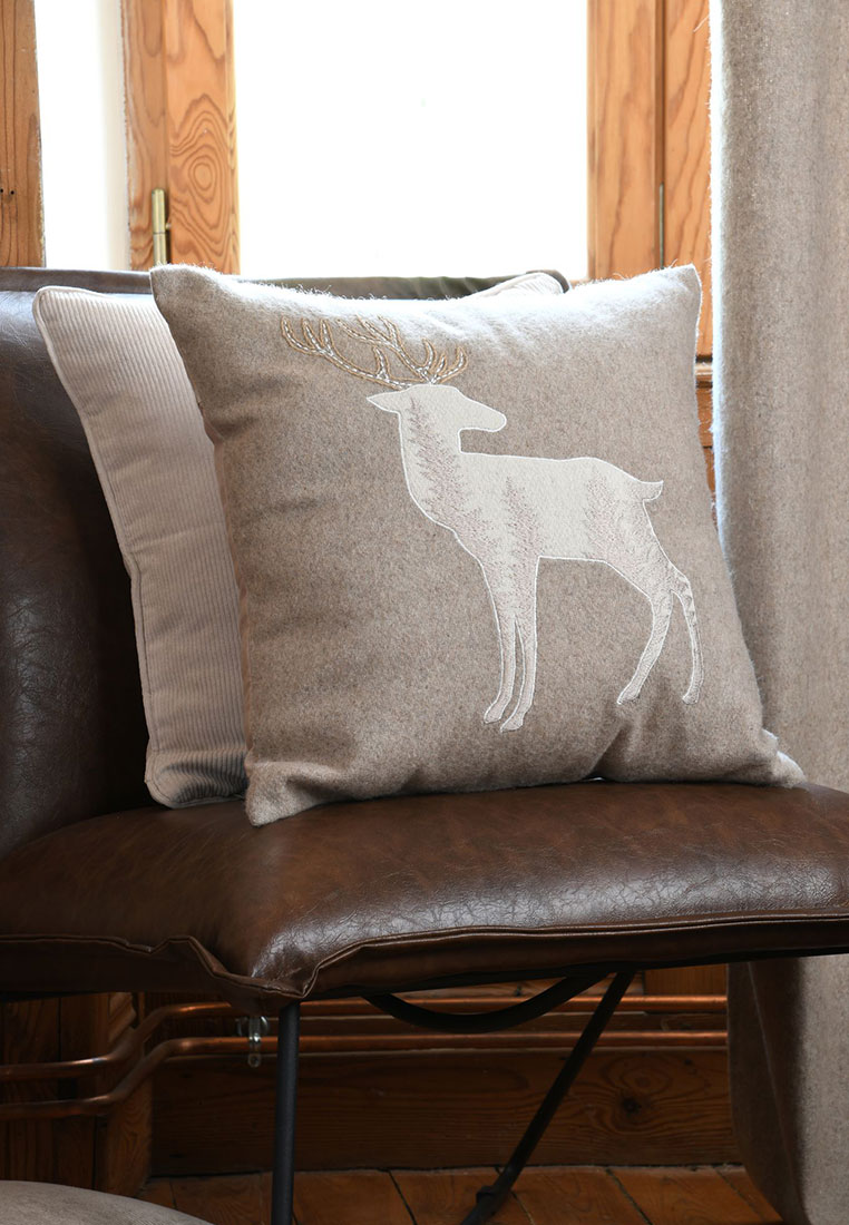 Das Kissen "Hirsch Denali" der Marke Podevache hat eine Größe von 45x45cm und ist im Chalet Chic Stil gestaltet. Es handelt sich um ein hochwertiges Kissen, das sorgfältig verarbeitet wurde und mit viel Liebe ins Detail hergestellt wurde. Das Sujet des Kissens zeigt einen Hirsch und Tannenspitzen, die auf das Kissen aufgenäht wurden. Das Kissen wird mit Inhalt geliefert und besteht aus 50% Baumwolle, 6% Acryl, 7% Polyester, 5% Nylon und 32% Wolle.