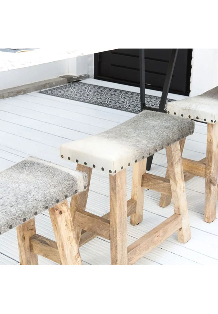 Stilvolle kleine Kuhbank mit Holzbeinen. Wir lieben sie einfach. Perfekt für ins Wohnzimmer oder auch für in den Eingansbereich.