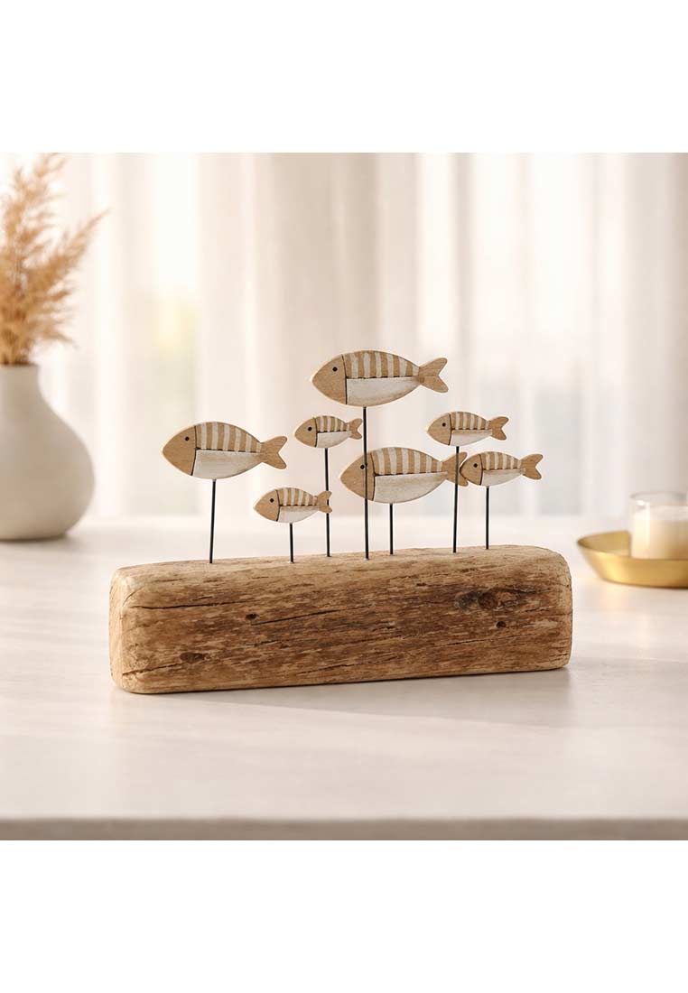 Diese dekorative Fischgruppe auf Fuss aus Paulownienholz überzeugt mit ihrer natürlichen Ausstrahlung und bringt eine ruhige, maritime Atmosphäre in den Wohnraum. Die kleinen Fische in Naturell und Weiss sind auf feinen Metallstäben arrangiert und scheinen wie ein schwimmender Schwarm über dem rustikalen Holzsockel zu schweben, wodurch eine leichte, lebendige Wirkung entsteht. Das hochwertige, leichte Paulownienholz unterstreicht den authentischen Charakter und macht jedes Stück durch seine individuelle Maserung zu einem Unikat. Mit einer Länge von ca. 30 cm und einer Höhe von 21.5 cm eignet sich das Objekt ideal als dekorativer Akzent auf Sideboards, Regalen oder Konsolen und fügt sich harmonisch in natürliche, maritime oder moderne Einrichtungskonzepte im Innenbereich ein.