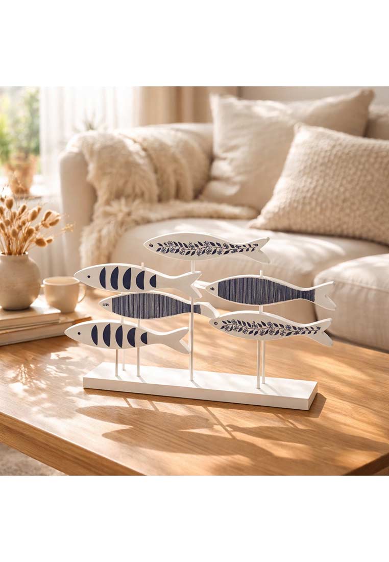 Diese dekorative Fischgruppe auf Fuss bringt maritimen Charme und eine stilvolle Leichtigkeit in dein Zuhause. Gefertigt aus MDF-Holz und in harmonischen Blau-Weiss-Tönen gestaltet, zeigen die einzelnen Fische unterschiedliche Muster, die zusammen ein lebendiges, dennoch ruhiges Gesamtbild schaffen und an einen Schwarm im Meer erinnern. Die filigrane Anordnung auf stabilen Stäben und dem schlichten Sockel verleiht dem Objekt eine moderne, luftige Wirkung, die sich ideal auf Sideboards, Regalen oder Konsolen platzieren lässt. Mit einer Länge von ca. 50 cm und einer Höhe von 30 cm setzt diese Dekoration einen schönen Akzent in Wohnräumen und sorgt für eine entspannte, maritime Atmosphäre im Innenbereich.