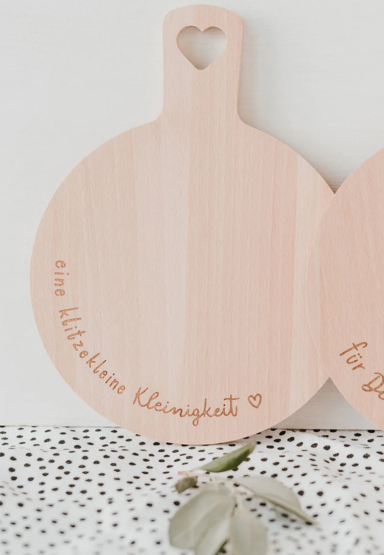 Unsere Mini Brettchen ist der perfekte Begleiter zum Servieren von Kleinigkeiten oder zum Servieren von Deinem morgendlichen Kaffee. Das Brettchen ziert der handgeschriebene Schriftzug "eine klitzekleine Kleinigkeit". Auf der Rückseite der Brettchen ist ein kleines Eulenschnitt-Logo eingraviert. Die Mini Brettchen haben einen Durchmesser von 18 cm und eine Stärke von 1cm. Du bist noch auf der Suche nach einem besonderen Geschenk? Wer freut sich nicht über ein tolles Holzbrettchen, auf dem sogar schon ein liebevoll selbst gebackenes Törtchen von Dir drauf dekoriert ist? Ein absoluter Allrounder, der Dir oder den Beschenkten immer wieder ein Lächeln ins Gesicht zaubert und Dich rundum glücklich sein lässt. Holz ist ein natürliches und organisches Material, das besonderer Pflege bedarf. Damit Du viel Freude mit unserem Schneidebrett Rund hast, beachte bitte folgende Pflegehinweise: Bitte reib unsere Mini Brettchen vor dem ersten Gebrauch von allen Seiten mit Öl ein. Diese Behandlung muss in regelmäßigen Abständen wiederholt werden. Die Geschirrspülmaschine bitte unbedingt meiden. Die Brettchen bitte mit lauwarmen, fließenden Wasser abwaschen und unmittelbar danach gründlich mit einem trockenen Tuch abtrocknen. Direkte Sonnen- und Hitzeeinstrahlung bitte vermeiden.