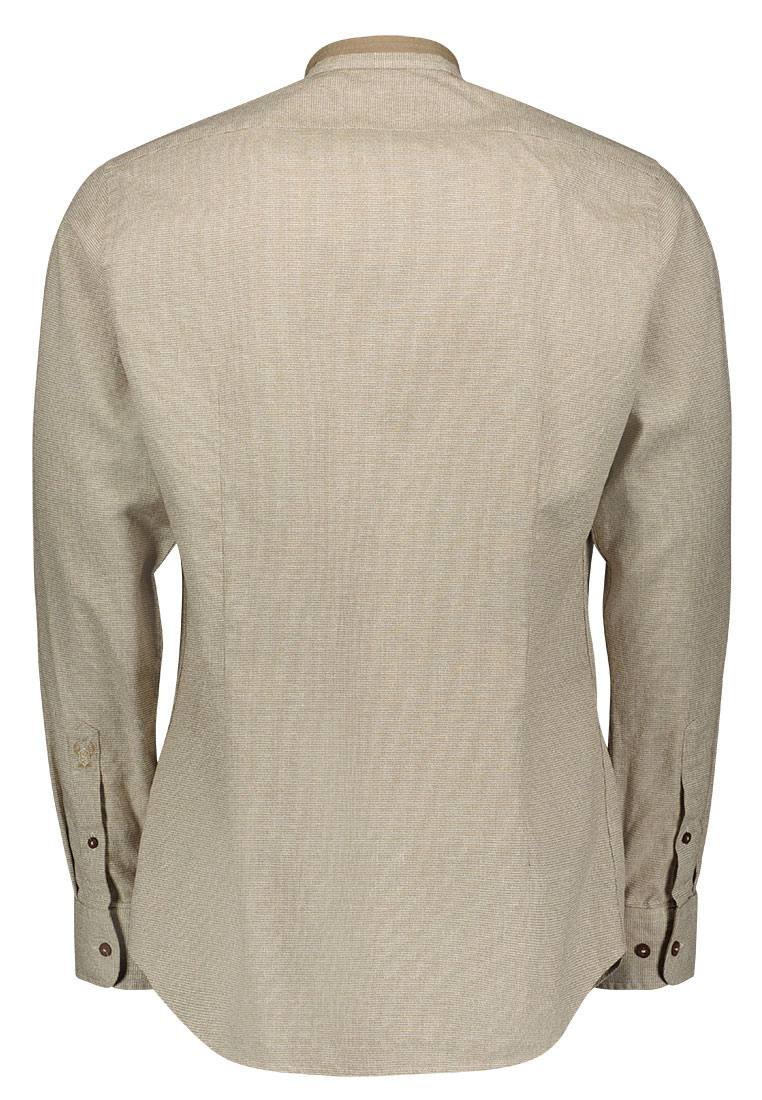 Das Hemd verfügt über einen modernen Stehkragen in beige und ist mit einer Uni-Einfassung an Kragen, Brusttasche und Manschetten versehen, was dem Hemd einen Hauch von Raffinesse verleiht. Die Struktur des Hemdes gibt ihm eine zusätzliche Dimension und macht es zu einem besonderen Blickfang. Die Farbe des Hemdes ist ein elegantes schlamm beige, das sich leicht kombinieren lässt und zu vielen Outfits passt.