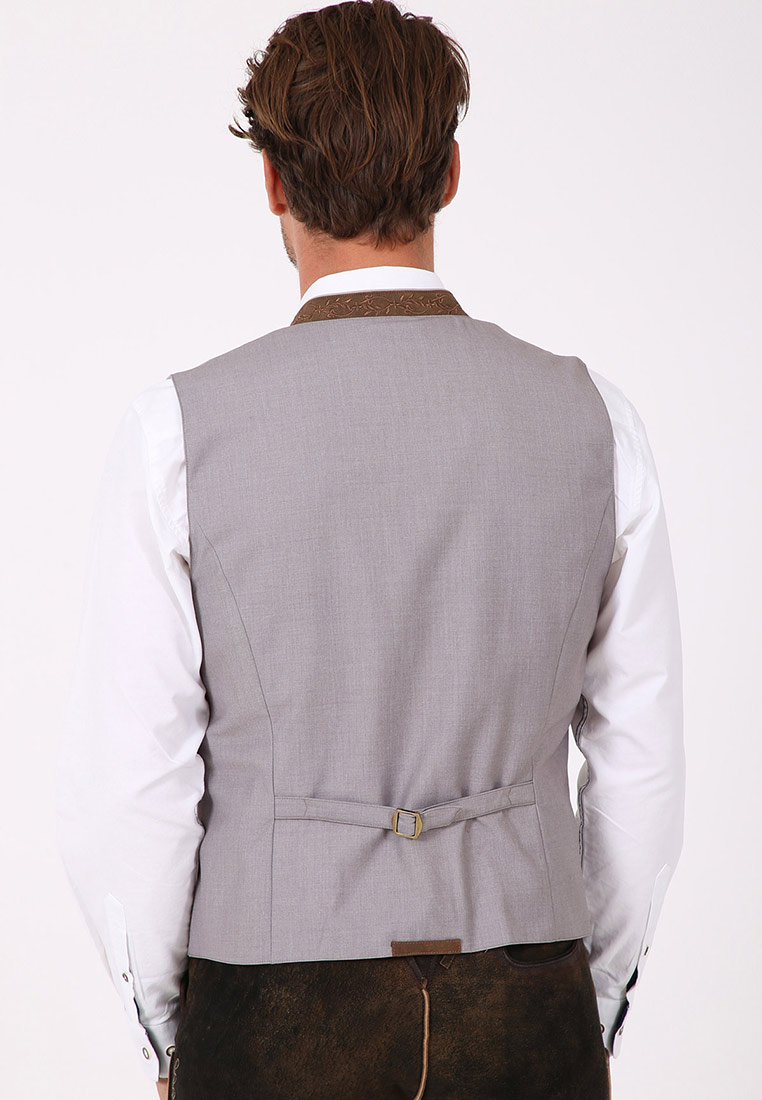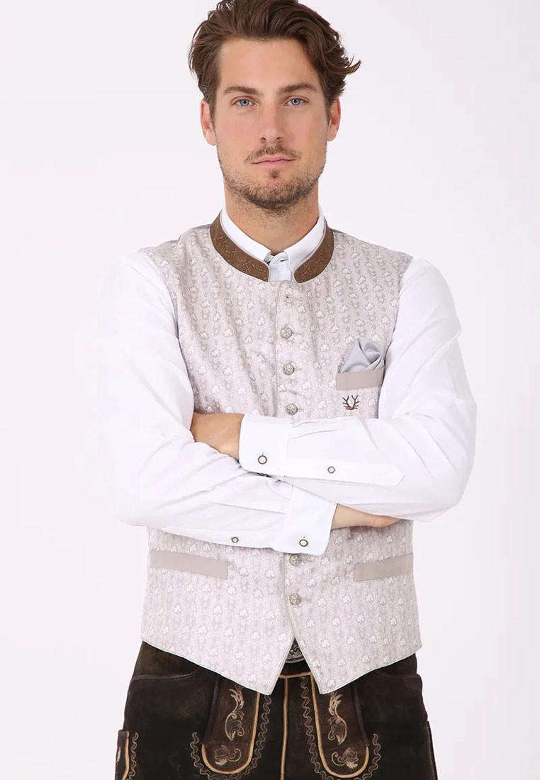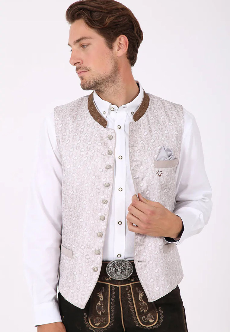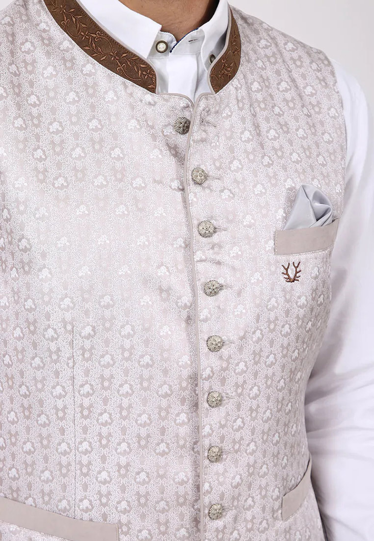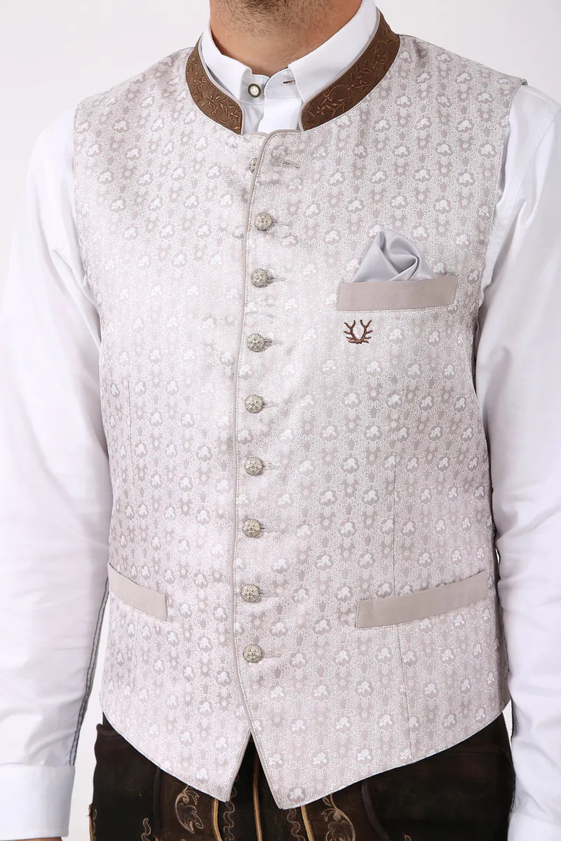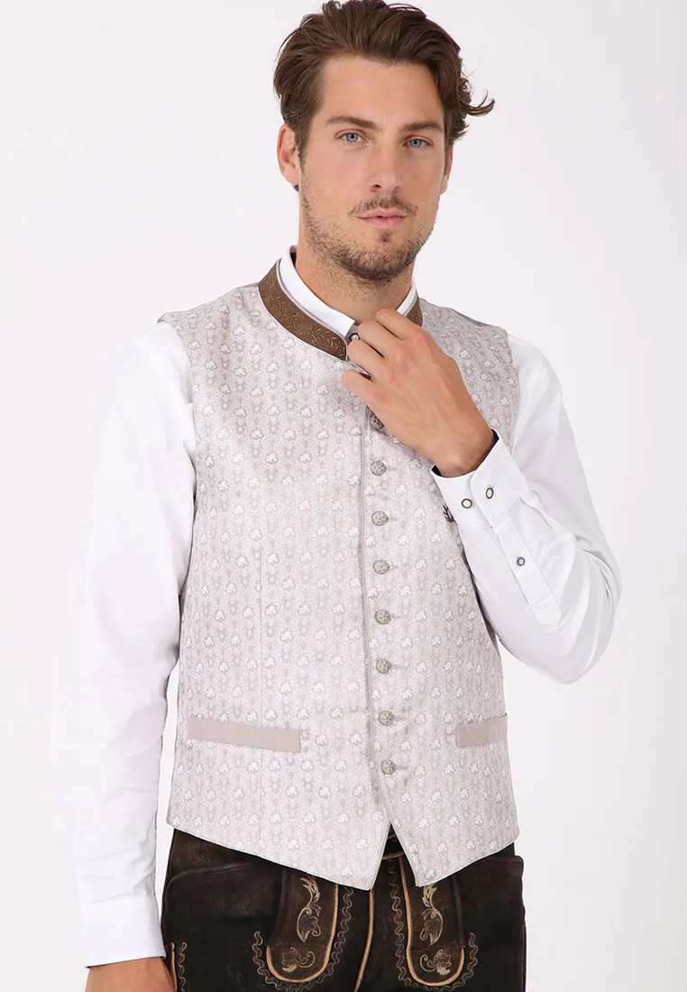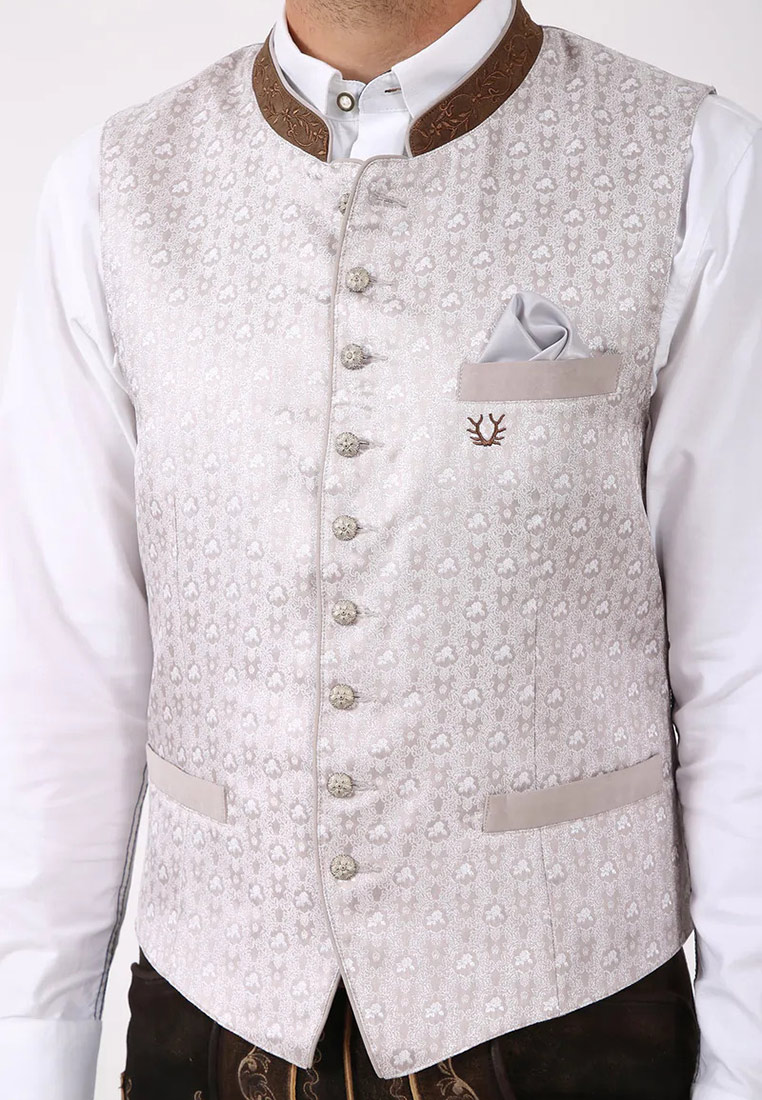 Trachtenweste Anselmo von Stockerpoint in taupe. Die hochwertige Weste ist aus einem hochwertigen Jacquard Stoff in Seidenoptik gefertigt. Die gerade Schnittführung garantiert eine sehr gute Passform und einen angenehmen Tragekomfort. Der klassische Stehkragen, die Taschen und die Knopfleiste sind mit einem farblich abgestimmten Paspel gefertigt und unterstreichen das exklusive Design. Trachtige Knöpfe in altsilber setzen sich gekonnt in Szene. Die Weste ist der ideale Kombipartner zu unseren Lederhosen und runden den Trachtenlook perfekt ab.